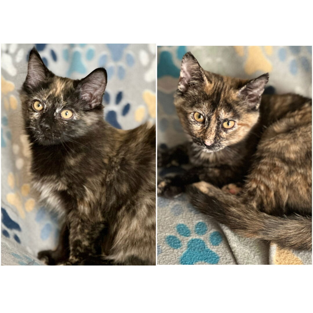 Mowgli is a stunning looking girl with cattitude. She is timid when it comes to people. She just needs some extra time and love. She’s always snuggling with her sister Ellie on the cat tree. Ellie is a beautiful tortie kitten. She is her mother’s twin. She’s a little shy at first but warms up pretty easily. these two sisters need to be adopted together If you are interested in adopting them, applications can be found on our website www.ahimsahaven.org. Meet and greets are with an approved application by appointment only. As always, cats that are ready to be adopted are spayed/neutered, have age appropriate shots, are micro-chipped, dewormed/deflead, and FEL/FIV tested.
