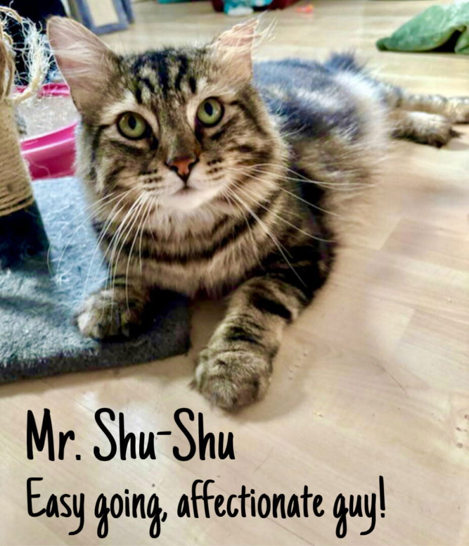 Mr. Shu Shu is a super handsome and sweet boy! He is approximately 3 years old. He has the most beautiful brown tabby pattern coat and the most adorable fuzzy paws. He has a bit of a "cauliflower ear," but it just makes him more adorable!! He is a mostly chill boy, who enjoys sitting by your side and getting lots of love. He does love to play with his favorite toys with you and, when he’s worn out, to snuggle into a nice cozy blanket. He has the cutest, sweetest meow! Mr. Shu Shu loves other kitties, but would be fine as your one and only, getting all the love and attention too. He has not met a dog but since he loves cats so much, he would probably be fine with a canine companion. This guy would be best in a home with no children. He will need time in a quiet place to adjust to his new surroundings, but once he is comfortable, he will be your best bud & love you forever! My. Shu Shu is FIV+ but that's no big deal! He's been playing with all his non-FIV+ kitty friends at his foster home with no worries at all, including his best bud and little shadow Lucy (FCID# 07/02/2024 – 148). Mr. Shu Shu is currently playing with his foster family. Please submit our no-obligation application for a meet and greet or to adopt today: https://forgottencats.org/adoption-application/ . Thank you! (Foster: Chrissy L.). ​