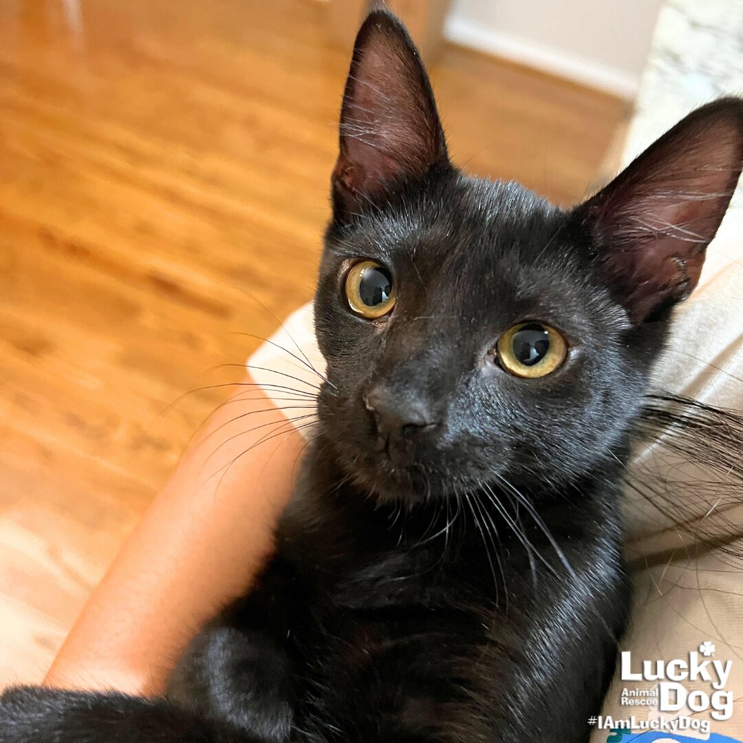 Please contact Mollie Gorney (mollieg@luckydoganimalrescue.org) for more information about this pet.Nala is in search of her kingdom!NALA NEEDS A FOREVER HOME!!!!! Name: Nala Best Guess for Breed: Domestic Short Hair Age: 8 months as of 12/13/24 (Estimated DOB: 4/9/24) SEX: Female Approximate Weight: 4.93 lb as of 8/5/24 Coloring: Black Type of Hair: Short Litter: Nala, Nova Gets Along With: Because of her young age, Nala will likely get along with other cats, dogs and kids with an acclimation period. We’re happy to help with tips and tricks! Currently Living at: Meo Maison Cat Cafe Check out our Lucky Cats on Instagram at the Meo Maison Cat Cafe Méo Maison Cat Cafe (1336 Wisconsin Ave NW, Washington, DC 20007). You can come visit me at Méo Maison Cat Cafe during the cafe’s operating hours! If you would like to visit the cafe, please make an appointment on their website (meomaison.com). If you want to adopt me, you will need to complete the adoption process through Lucky Dog Animal Rescue. I am Looking For: My loving forever family! Hi! I’m Nala, and I am a cute little kitten! I won’t ask for much- just some love, cuddles and lots of toys so I can run and play and be my kitten self. Two kittens are better than one, and I’d love to be adopted with one of my super cute siblings! What My Foster Says About Me: 7/31/24: Nala is on the more curious and playful side compared to her sister Nova but is also shy at first. She enjoys playing with toys and chasing her sister as well as other toys. With time she was able to get along with another kitten her age. She is also affectionate and will try to get as close to you as possible by going on top of you. She likes to follow you around the house and she purrs pretty easily and is ready to be anyone’s forever loving kitty!9/6:/24: Nala and Nova love to play with each other as well as with any toy, yarn, laser. After they get some play time they love to receive rubs and will purr very easily. Nova is very curious and enjoys following you around like a puppy and Nala likes to follow but also observe from a short distance. They are playful, affectionate, and recently they are starting to have their adult fur slowly grow in.9/9/24: They are curious kitties and will follow you where you go.9/24/24: Nova and Nala are friendly and energetic kitties who loves to play but also loves to have their rub sesh. They love to chase after toys and play tag/wrestle with each other. They like to be in human presence and receive attention.10/9/24: Nova and Nala are 2 spunky girls. They are in their most zoomy fun phase currently. They don’t have as much time for cuddles as when they were younger, but they enjoy pets if you find that rare moment they are sitting still. They are getting along well with my resident cats and following all the cat social etiquettes. Kitten Vetting Requirements: Your kitten may not be fully vaccinated upon adoption. You will be responsible for providing whatever remaining vaccines are needed to complete the kitten vaccine series. TO ADOPT: The adoption fee for adult cats is $200 ($350 for two cats adopted together). The adoption fee for a kitten (under 7 months old) is $220 ($380 for two kittens adopted together).If you are interested in adopting, please complete the Adoption Questionnaire online at bit.ly/adoptaluckycat. Lucky Dog Animal Rescue does our best to provide accurate information about the cats we have for adoption. That said, we cannot make any guarantees about age, breed or temperament. Thank you for contacting Lucky Dog Animal Rescue and helping to save a life! Please visit us online at www.luckydoganimalrescue.org . BE A FOSTER!!! Fosters make it possible for Lucky Dog Animal Rescue to save and care for homeless and abandoned dogs! To learn about fostering, please contact fostering@luckydoganimalrescue.org BE A SPONSOR!!!! Sponsors help Lucky Dog support the many dogs we save. To learn more about sponsorship, please contact info@luckydoganimalrescue.org !