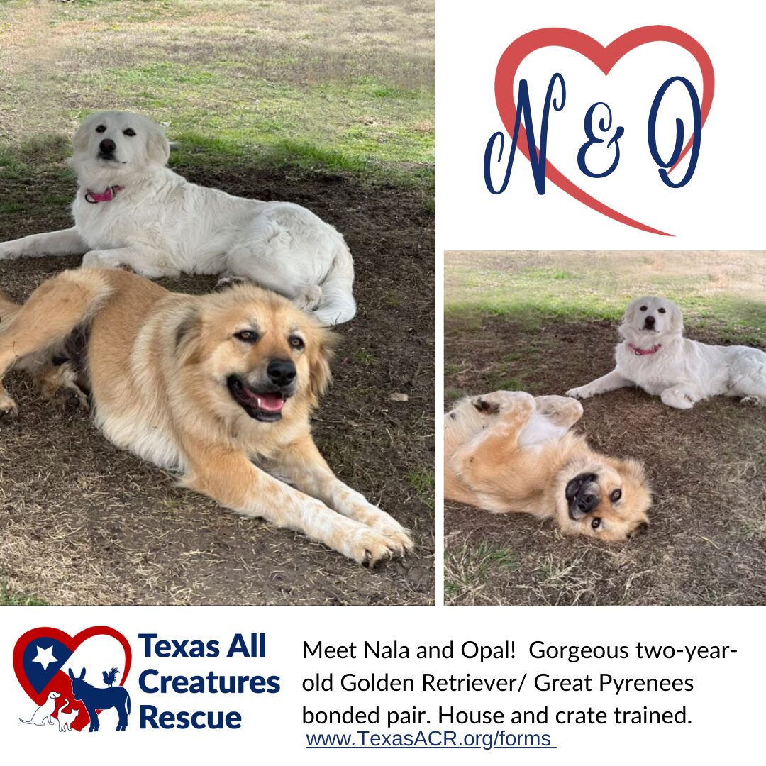 See Nala and Opal’s HomepageGo to our official website ♥️ Meet Opal & Nala! ♥️ Four months ago, Opal and Nala, a stunning Golden Retriever/Great Pyrenees mix, joined rescue with their 12 precious puppies, all of whom have now found loving homes. Now, it’s these sweet girls’ turn to find their forever family, together! Opal and Nala are a bonded pair with gentle, loving temperaments. Nala is the more outgoing of the two, while Opal is a bit more reserved, but both are incredibly affectionate and wonderful with other dogs. They have been fully vetted, spayed, microchipped, and are both house and crate trained. If you’re looking for a pair of devoted, well-mannered companions, Opal and Nala are ready to bring double the love into your home! We are a non-profit 501c3 Animal Rescue located in Dallas/Fort Worth, Texas. Our passion is centered around assisting animals that have been abandoned, neglected, or abused. We are a foster-based rescue consisting of 100% volunteers. If you are interested in becoming a foster, please email info@TexasACR.org
