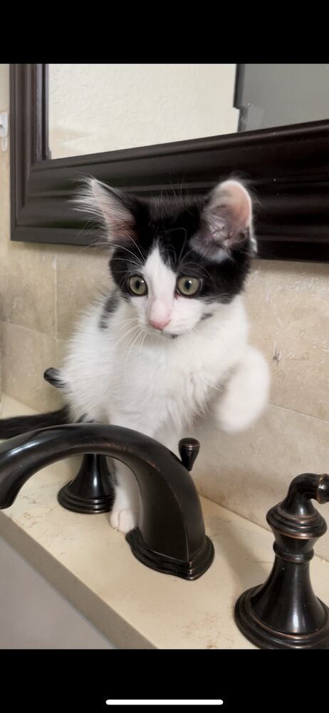 Meet Natasha, a sweet and spirited kitten who's sure to steal your heart! Her soft, white coat is accented with a black cap, tail, and the most adorable little pair of angel wings on her back.Natasha purrs constantly, whether at play or rest, and especially when she's snuggling with her favorite people. She's very vocal, too, and will tell you exactly how much she's enjoying your attention with her tiny little meows. She is an active little girl, who sometimes enjoys wrestling with her three rambunctious brothers, but is generally a calm kitty who loves nothing more than human affection. Natasha is looking for a loving home where she can continue to grow and thrive. If you’re ready for a talkative, cuddly companion, this sweet lil babygirl is eager to meet you!For more photos and videos please see our website www.hdbnqrescue.org/queens