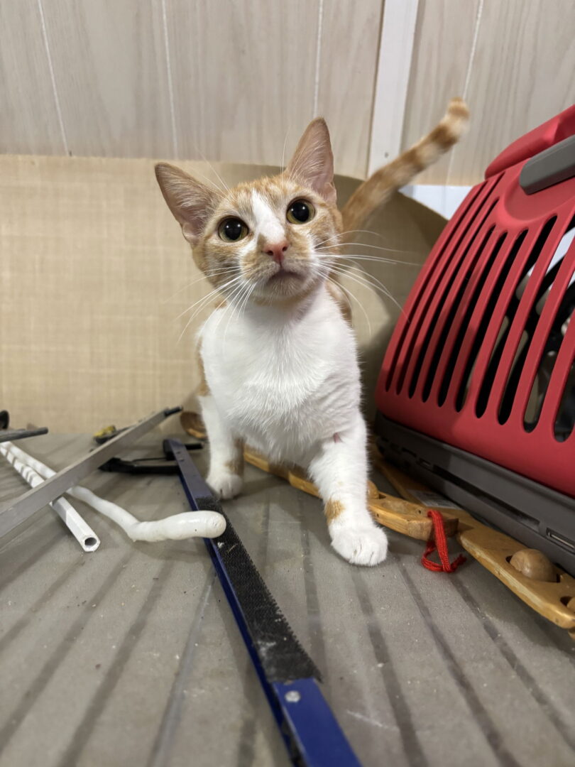 Hi, I'm Neosporin! Don't let the name fool you, I'm not here to heal your boo-boos (though my purrs might have some therapeutic properties). I'm more like a tiny, energetic hurricane of fluff! I get the zoomies – oh, do I get the zoomies! – especially at random hours of the day (and night… sorry!). Anything is a toy in my eyes: a dust bunny, a rogue sunbeam, your shoelaces… you name it, I'll play with it! Okay, okay, so I'm also a little timid. New situations can be a bit scary, but I'm a super sweet kitty deep down. I love to hang out on the back of the couch or up in my cat tree – prime real estate for observing the world (and plotting my next zoomie attack!). Dogs? They don't bother me one bit. Loud noises? Meh. I’m pretty chill once I get comfortable. I get along great with other cats and kids, too! I'm still learning to trust, but once I do, I promise to shower you with purrs and head boops. I'm looking for a patient and loving home where I can play, explore, and eventually cuddle on your terms. If you're looking for a playful, slightly quirky, and ultimately incredibly sweet kitty, apply to adopt me today! I promise, I’m worth the occasional midnight zoomies! Neosporin =^..^=, DSH Orange Tabby and White, Female, DOB 4/14/2025 https://cataroundtownproject.org/adoption-application/