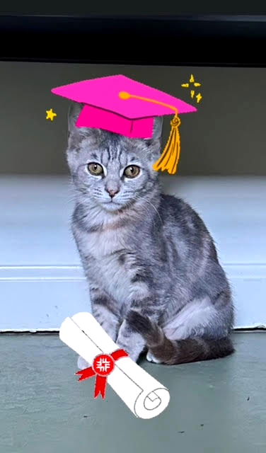 Kid-, Dog- and Cat-Friendly!! Is your kitty looking for a friend? Please meet Noelle! Noelle, a recent graduate of Miss Jo Anne’s Finishing School, is excited to have been accepted into the prestigious Pet Smart Adoption Center Boarding School. She looks forward to continuing her education about humans while refining her posture and manners. She is hoping to find her furever home with a wonderful visitor like you. Noelle received the Very Pretty Award from Miss Jo Anne. Although she emphasizes character as of the utmost importance, Miss Jo Anne, who was often overheard saying “She is just the prettiest kitty”, felt compelled to bestow this honor on Noelle. Noelle is also a purrlific purrer and loved to snuggle with her brother Lil’ Des (aka Desmond, adopted). She likes to leap on to her scratching post to go after her cat dancer toy. She is so much fun to watch play! Under Miss Jo Anne’s tutelage she learned social & dining etiquette, litter box manners, proper play, to respect elder felines and that dogs can dwell with cats. Miss Jo Anne’s kitties come to you with Purrfect Pedigree, and of course the always-love-you warranty! See more of Lil’ Des and Noelle Instagram : @MissJoAnnesFinishingSchool Facebook: MissJoAnnesFinishingSchoolforForgottenCats . Noelle is hoping for her own forever family. She must have another kitty friend to play with – she misses her brother and is back with her foster family, happily playing with the resident cats. Please check out her video before she went to the adoption center with Desmond: https://www.youtube.com/shorts/Y8eC8CZO–4 . Here is the video of her returning to her foster home and to Mr. Skittles: https://www.youtube.com/shorts/1odt-2h2crI . Please submit our no-obligation Adoption Application for a meet and greet or to adopt: https://forgottencats.org/adoption-application/. (Foster: Jo Anne J.)