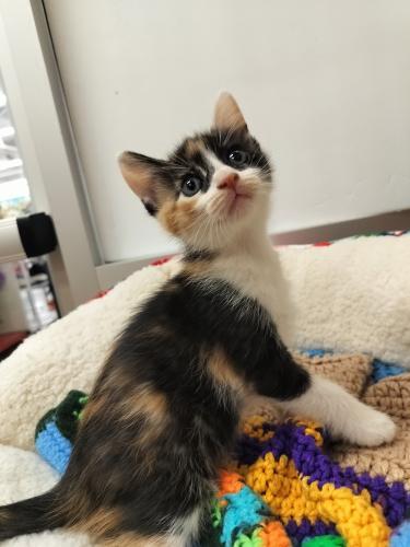 Norma Ray is the masked wonder of her litter. Norma Ray. is a beautiful, short-haired, multicolored kitty. She is one of three Calico Kittens in this litter.Norna Ray and her sisters remind me of the coloration of Koi fish swimming in the Fresno Japanese Garden. Norma Ray is the cool, calm and collectiveone of the litter. Norma Ray will chill while her littermates all go after the same toy. She will watch and pounce on the toy and surprise the other kitties. Norma Ray’s has precious, friendly personality. Norma Ray is independent and played back. She enjoys sunning on the car tree, watching the birds coming to the feeders, and paw-plaing with the other kitties next to her. Norma Ray is happy to sleep on a cat tree and will sleep with you at night when invited. Like her siblings, Norma Ray is a well-adjusted kitty. She gets along with the four adult cats in the home and engages when people visit. Norma Ray will make anyone a fabulous addition. For more information & an online application go to https://www.cathouseonthekings.com/adoption/cat.php?id=26907&ts=1761721409&src=rg