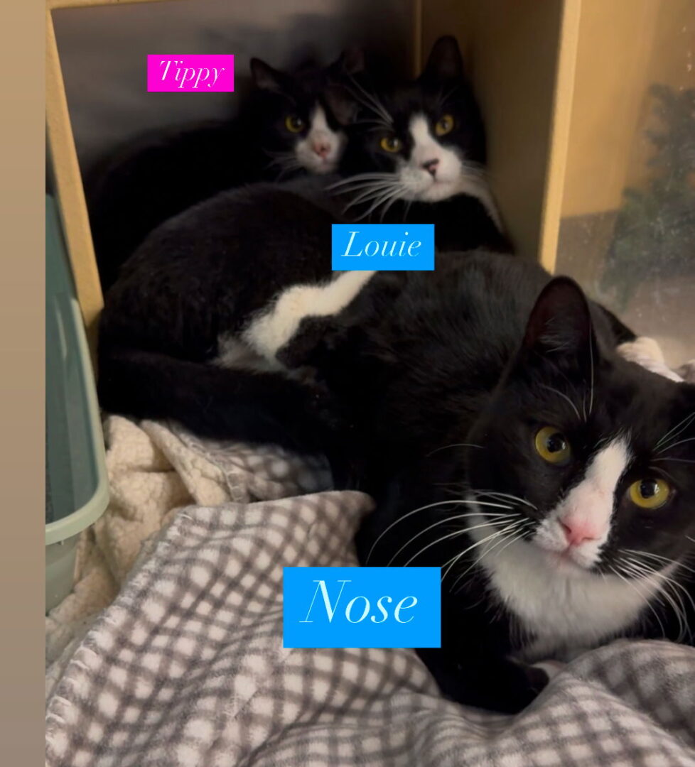 See Nose’s HomepageGo to our official website Trio of Tuxie siblings Louie (male black nose) Nose(female pink nose) Tippy( female black spot on nose) Located: Manalapan, NJ Petsmart Hi there! We’re Louie, Nose, and Tippy—three adorable siblings who started out as baby kittens, having a nice indoor life. When we got older and we lost our kitten appeal people disguarded us outside to brave the harsh outdoors- life wasn’t easy, but our charm and friendliness helped us make friends with a new kind family (and their dog!) who made sure we found our way to safety. Since being indoors again, finally!- we’re never looking back! It’s where we want to be. We’re sweet, affectionate, and full of gratitude for the simple joys of indoor life—soft blankets, cozy naps, tasty food and treats, and, most of all, each other. You see, we’ve been through everything together, leaning on one another when times were hard. Staying together would be our dream come true. We know that’s a big dream, but it’s not impossible. We promise, if you give us a chance, we’ll fill your home with more love and joy than you can imagine. And if staying together isn’t in the stars, we’ll adjust, as long as we’re placed with other cat- or dog-friendly companions who can help us feel at home. Take a chance on us, and you won’t just be saving three lives—you’ll be gaining three loyal, loving, and grateful hearts forever. They are fixed, microchipped, FeLV/FIV negative and up to date on vaccines. Reach out if interested to cats@rescueridge.com if you want to set up a meet and greet. Or apply online at Rescue Ridge website. #catrescue #catadoption #adoptdontshop #savealife #catrescue #catadoption #adoptdontshop #savealife