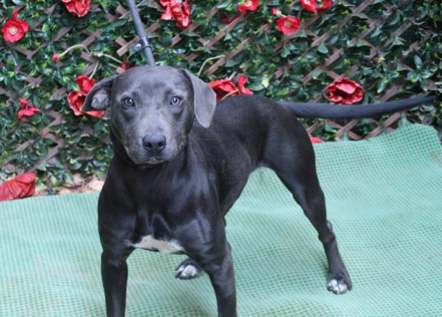 Nova is the sweetest, gentle, most snuggly girl! She is a Velcro dog and wants to spend her time snuggled up to humans or dogs. She is listed as a Weimaraner mix, dark grey with beautiful greenish yellow eyes, and weighs 38 pounds. Nova was picked up as a stray, found in a field with another dog. She did well in the car. She may not have a lot of experience in a home and will require patience as she learns, but would love to an opportunity to snuggle on your couch. Nova is potty trained-ish, she will require guidance and basic training but is eager to please. She is great around young children, very gentle and did not attempt to jump. She has been friendly with all ages and genders or humans and dogs that I’ve seen her interact with, including my two medium sized dogs. She is a couch potato but after given the opportunity to decompress I believe she will become more active. She is not food obsessed and did not exhibit any rude behaviors. I have not observed her with cats. Nova would really benefit from a family of any size, with lots of love and patience she will transform into the perfect companion.