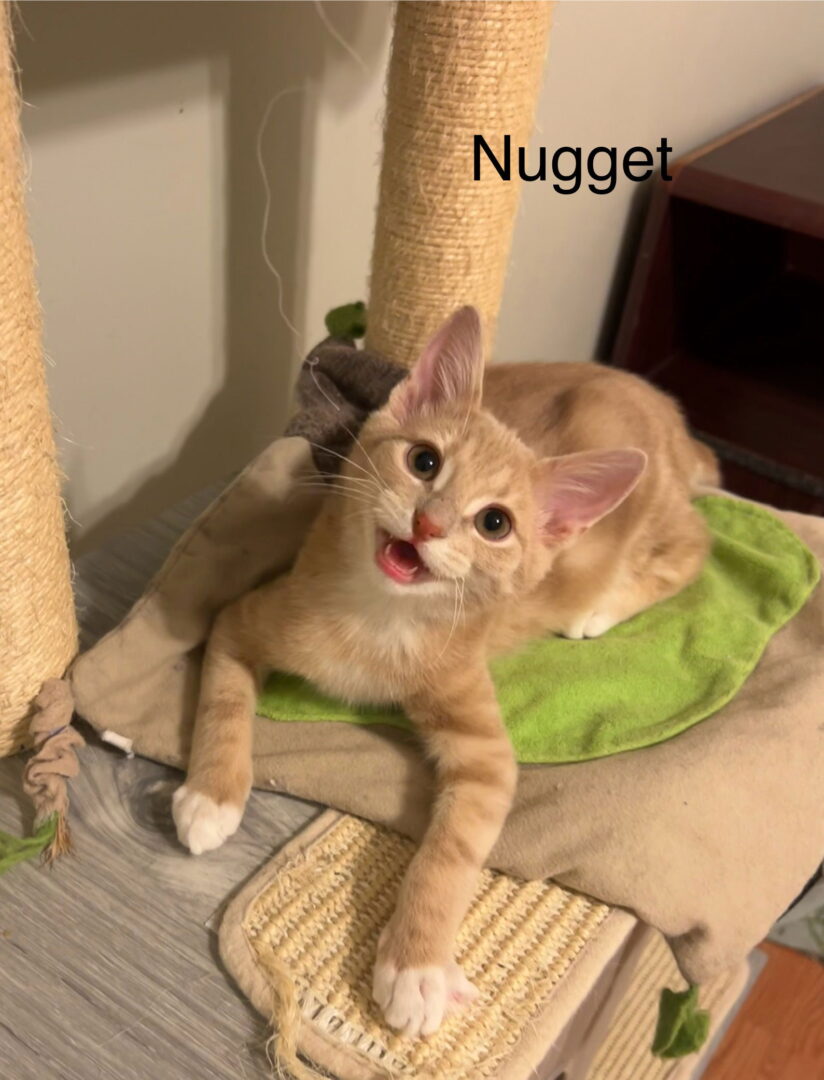 See Nugget’s HomepageGo to our official websitesib: Nami, Neema, Nessa, Newt, Niko, NirvanaNugget is a light buff-colored male with captivatin green eyes and he’s got the personality to match! The silliest of his seven siblings, Nugget is always the first to start a game, find a new hiding spot, or do something completely ridiculous just to make you laugh. He has the softest little purr. He’s playful, curious, and just a little bit clumsy — in the most endearing way. Whether he's chasing shadows or trying to fit into a box that's clearly too small, Nugget brings joy and giggles wherever he goes. If you're looking for a sweet, spunky kitten who will keep you entertained and melt your heart daily, Nugget's your guy.