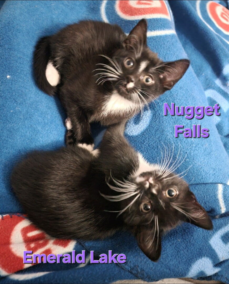 See Nugget Falls & Emerald Lake (bonded pair)’s HomepageGo to our official websiteYou can fill out an adoption application online on our official website.Please contact GW for more information about this pet.Thanks for your interest in a pet from A.R.F.! If you see a pet here, they are still available for adoption and you should apply through our adoption application on our website at https://www.arf-il.org/adopt/application/ Look at these “tuxedo twins!”! Not only do they have gorgeous markings, they look like they got in line twice when eyebrows and whiskers were being handed out. They are also more than just a pretty face. They are great little cats. Nugget Falls (M) and Emerald Lake (F) were born in their foster home on September 11. They are sweet, sturdy, happy kittens who have never known anything but love. Their mama cat was spectacular, and they have had a great time playing with their siblings and with their foster mom. They are social, curious, fun little babies who want to go to a home together. To see more about this pair, check out their foster mom’s Instagram @gloriawarshaw. Both cats are microchipped, up to date on all vaccinations, spayed/neutered, and litter box trained. Their combined adoption fee is $330 ($165×2). Please note A.R.F. does not approve applications for any kitten under 6 months of age to families that live outside of Illinois and/or beyond 100 miles of Wheaton or Glen Ellyn, IL. If you are interested in meeting Nugget Falls & Emerald Lake, please fill out our online kitten adoption application at https://www.arf-il.org/adopt/application/ today! Once your application has been approved, an A.R.F. volunteer will be able to contact you to arrange a meeting. Thank you for considering a rescue pet from A.R.F.-Animal Rescue Foundation! We are based in Wheaton, IL and conduct adoption events in the DuPage County area. If you are interested in adopting one of our pets, please submit an adoption application at https://www.arf-il.org/adopt/application/ Adoption appointments are scheduled based on the order of applications received, so submit your application early! Submitting an application does not commit you to any animal but does get you a head start with the adoption approval process. Due to a high volume of applications, we are often unable to respond to questions or schedule meetings until your application has been approved. More information about our adoption process can be found on our website here: https://www.arf-il.org/adopt/ As an all-volunteer, foster home-based organization, A.R.F. Animal Rescue Foundation does not have a facility where applicants can visit our animals. Please visit https://www.arf-il.org/events/ for a list of our upcoming adoption events. Thank you for choosing to adopt, not shop!