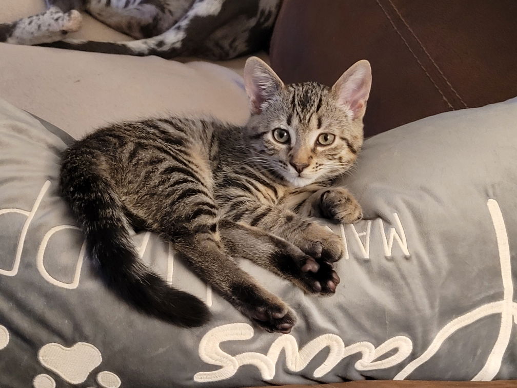 Obie, aka Bentley is a sweet guy who came to us with an injured tail which is completely healed with a slight bend to it. He is an active kitty who loves to play with his doggy friends, in fact he prefers hanging out with the dogs and may think he is one!!!! When it is nap time he prefers his foster mom’s lap. Bentley has a favorite stuffed toy…a small flying squirrel that he carries everywhere even to bed at night! Sometimes he thinks he is a flying squirrel and jumps on and off the furniture. Bentley will keep you entertained! At night, he snuggles with his best buddy, the dog. Bentley is a gray tabby, with lots of stripes everywhere except his dotted belly and green eyes. He has a birthdate of 7/8/2024, up to date on vaccinations and neutered. Bentley is looking for an indoor home with older children due to his activity level, toys and perhaps a dog buddy.