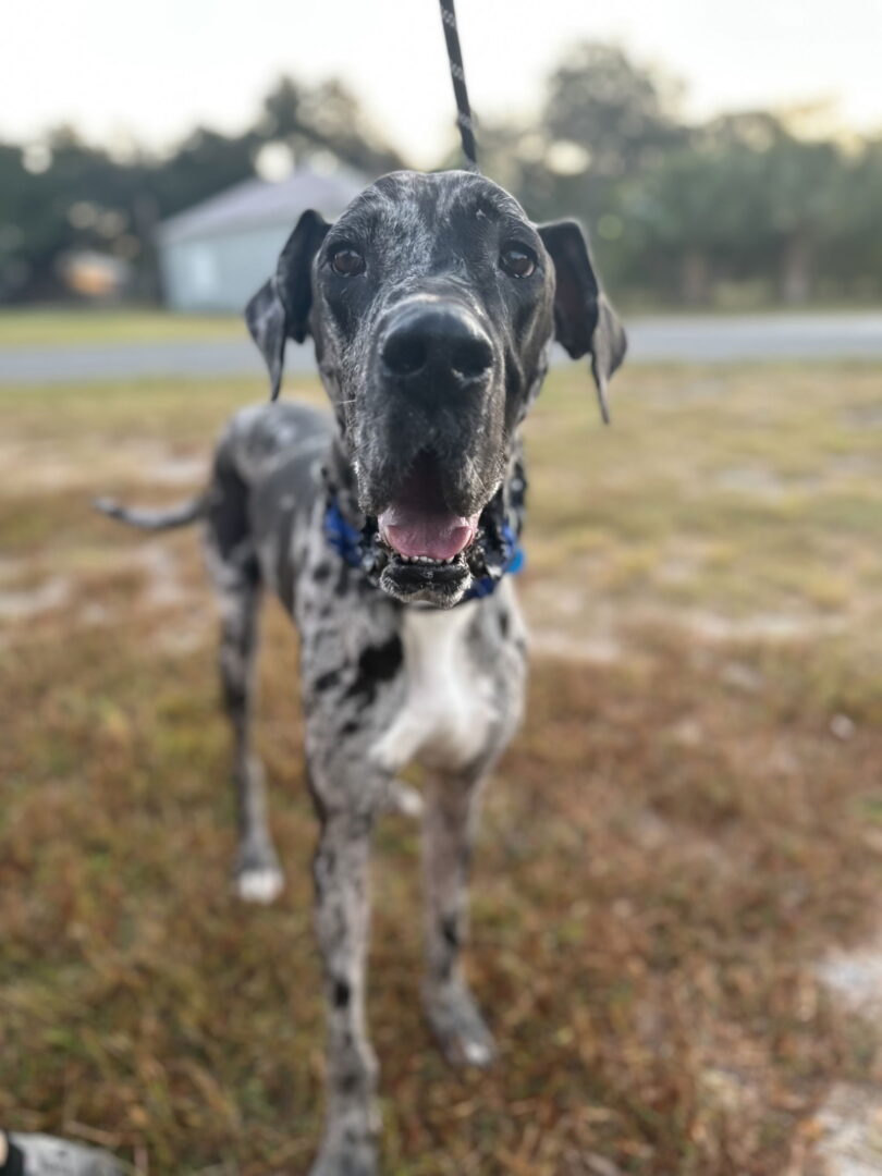 See Odin FH’s HomepageGo to our official websiteYou can fill out an adoption application online on our official website.Odin — Handsome Merle Great Dane Meet Odin — a gorgeous merle Great Dane with the sweetest personality and a huge heart to match his future size. At about 100 lbs now, this gentle giant is only 1½ years old, so he’s still growing and will likely be considerably bigger when he finishes filling out. If you’re ready to share your home (and your lap space!) with a magnificent, playful companion, Odin might be your match. About Odin Odin is: A stunning merle Great Dane, ~1.5 years old Currently ~100 lbs and still growing Playful, affectionate, and good-natured Housebroken and crate trained Comfortable around children — he has been around small toddlers Dog-friendly and enjoys other dogs Cat-friendly Loves baths Enjoys walks and exploring with his person Personality Odin is a big softie: curious, playful, and eager to make friends. He loves attention but also settles nicely when asked. He’s used to children and other animals, making him a great fit for a family or adopter prepared for a loving, giant companion. Ideal Home The best home for Odin would be: A family or individual prepared for a very large, active dog Someone able to provide daily walks, consistent training, and mental stimulation A home with room for a giant-breed dog (a fenced yard is a bonus) Households with children or other pets are possible — meet-and-greets will confirm compatibility Great Dane Care — Important Things to Know Great Danes are loving, gentle dogs, but they do come with special care needs because of their size. Anyone interested in Odin should be prepared for: Giant-Breed Nutrition Great Danes need high-quality, large/giant-breed dog food to support healthy joint development. Overfeeding or improper diets can increase the risk of bone and joint problems. Meals are usually split into 2–3 smaller feedings per day to help reduce the risk of bloat. Health Considerations Common Great Dane needs include: Hip and joint support as they age Preventative care for bloat/GDV (a serious condition giant breeds are prone to) Regular vet care to monitor weight, joints, heart, and growth Danes are short-coated dogs and can be surprisingly sensitive to cold — sometimes they need a sweater in cooler weather. Exercise Requirements They need regular daily walks and playtime. Danes are typically calm indoors once mature, but they benefit from good physical and mental activity. Avoid excessive jumping or rough play while they are still growing to protect developing joints. ️ Space & Lifestyle Great Danes are indoor dogs — they thrive close to their people. They do require space to stretch out, move comfortably, and rest. Soft bedding is recommended for their joints. Personality & Social Needs Danes are famously known as “gentle giants.” They bond strongly with their families and want to be involved in daily life. Training and socialization are important, especially as they grow into their full size.