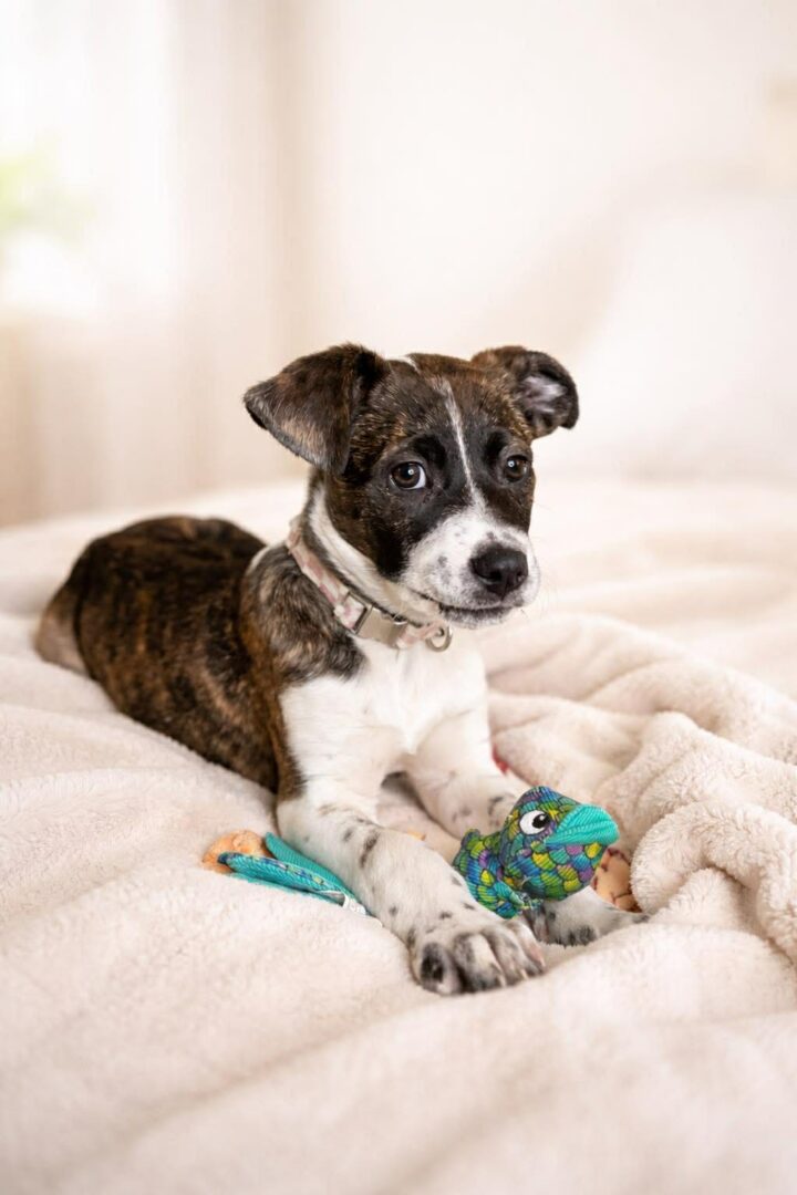 See Olga’s HomepageGo to our official websiteYou can fill out an adoption application online on our official website.This animal is in foster care, and details are based on foster observations and may change.This stunning Brindle and White pup is ready to find her forever family! She is as smart as she is sweet, with a unique ‘tiger-stripe’ coat and the most soulful eyes.​Personality: A curious, gentle girl who loves toys and snuggles.​Training: She is a star student currently working on her house-training.​Health: She will go home spayed, microchipped, and fully up-to-date on vaccinations.​She’s a total head-turner with a heart of gold. Don’t wait. Apply for pre-adoption today to bring this little lady home!Adoption applications are reviewed based on the best fit for the animal, not on a first-come, first-served basis. Submitting an application does not guarantee adoption. If you believe this animal may be a good match for your home, we encourage you to apply.