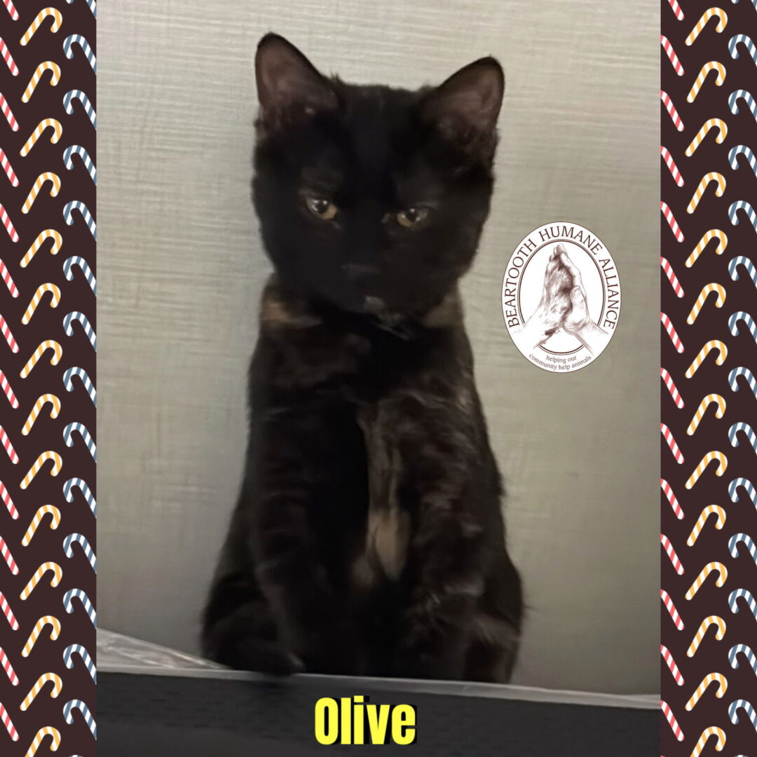 Contact BHA today to arrange to meet your furry friend! (406) 446-3500 or info@beartoothhumane.orgOlive you! MEET OLIVE Olive is everyone’s welcome committee! The first to greet you when you walk in, this friendly girl adores people, gets along with kids and dogs, and is fully litter box trained. She’s full of love and ready to brighten your home! Learn more at www.beartoothhumane.org/adopt or call 406-446-3500 to start your adoption adventure!