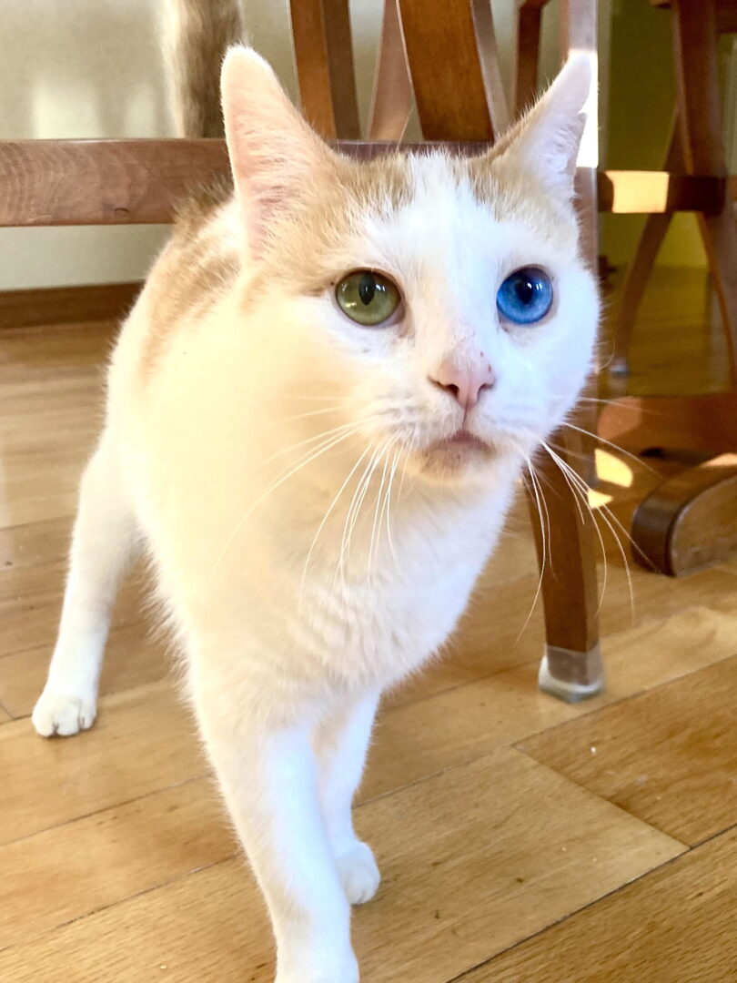 Cat-Friendly!! Not a furniture/counter jumper!! Meet Olive, the odd-color eyed beauty! Her striking eyes are completely different colors; one emerald green, the other deep turquoise blue. The technical term for odd-colored eyes is heterochromia iridium, where each iris is a different color. This is an extremely rare trait and usually only occurs on cats with white coats. Listed on the rarity scale of 1-10, odd-colored eyes are a “9”. The trait does not affect her eyesight or hearing and she is perfectly healthy. Not only is Olive a “9” on the eye color scale, she’s a “10” on the sweetness scale. She is friendly and gentle, always wanting be near her people. She likes a warm lap, but is also content resting on a soft rug or under a bed. Unlike most kitties, she’s doesn’t jump up on furniture, chairs, or counters! She’s also not a furniture-scratcher, preferring to use a scratching pad when the urge arises. Olive’s personality is gentle and ladylike. She pretends to think playing is just for silly kittens, yet when her people are out of sight she’ll hunt a toy mouse and gleefully paw it, toss it in the air, and chase it across the floor. With some time, she’ll likely become more responsive to interactive play, but for now, she’s perfectly content to play alone. Olive is very responsive to the human voice, and happily comes when you call her name. Olive’s young life has been a difficult one. She apparently was loved as a kitten, taken in and given a good life. Unfortunately, like so many cats, once she outgrew the “cute kitten stage”, she was cruelly discarded and put out, unprepared and without being spayed, onto the brutal city streets. Unskilled at fending for herself, she struggled to survive. Suffering from hunger, thirst, and the relentless stalking and harassing from the neighborhood’s feral un-neutered males. By the time she was finally rescued, Olive had already given birth to a least two litters of kittens (the last litter was rescued and are now in forever homes). Now that her nightmare is finally over, and she’s safe in the comfort of her foster home, it’s time for sweet Olive to have a forever home of her own where she’ll be loved and spoiled, as she so deserves. Olive is okay around other cats when introduced properly. She hasn’t been around children yet but is fine around any adult and would likely be just as fine with kids. We don’t know how she’ll react to dogs, but with her calm nature, she’d likely be fine with a gentle dog. Olive tested ‘Light Positive Line for FIV.’ FIV+ cats can live and play with FIV- cats. Please check out the quick facts sheet. Please submit our no-obligation Adoption Application for a meet and greet or to adopt at: https://forgottencats.org/adoption-application/. Thank you! (Foster: Carla D.)