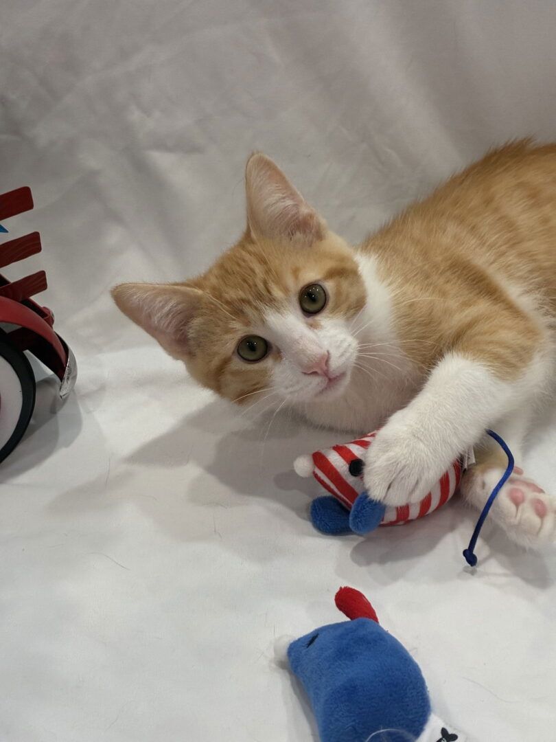 Ollie is a beautiful spunky orange and white boy who is approximately four months old being born in March 2025. He loves to play with all the other kitties and is very sweet and gentle. He also loves to snuggle with you. He loves all toys especially the cat tree. He would do great in a home with other cats. He loves to purr. All around he is the sweetest boy! Ollie is up-to-date on all his vaccinations, combo tested negative, microchipped and he will be neutered as he is not quite ready yet! We are open to doing an adoption pre-neuter with the understanding that as soon as he is ready he will be scheduled for neuter. Adoption fees are $75 for one kitten and 2 for $125. Applications can be found at https://www.pfcatrescue.org/adoption-application/