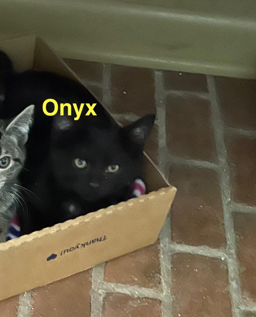 Meet Onyx — a tiny star in a velvet-black coat Female kitten, 16 weeks old, black coat, last of the litter. When a resident found kittens in a box on her porch in the cold, she didn’t know where to turn. After reaching out to several rescues, Forgotten Cats answered the plea—and not only saved the kittens, but also their mother Calliope and father Hector. All six are now safe, warm, and thriving in rescue care. Onyx, just 12 weeks old when she was brought in from the porch with her three sisters, received all the veterinary care she needed. Though she and her family were frightened at first, gentle handling, soft beds, and lots of toys helped them blossom into sweet, purring kittens. Onyx is a female black beauty with a tiny star-shaped patch of white on her chest—a perfect little sparkle to match her personality. She’s a true lap cat, happiest when curled up in loving arms. She purrs endlessly during cuddle time, then bounces off for the next bout of play before returning to the nearest warm lap. Her foster home included other cats and a standard poodle, and Onyx got along wonderfully with everyone. She’s a confident, affectionate kitten ready to bring comfort, companionship, and plenty of purrs to her forever family. Can Onyx curl up in your lap and make your home her home? Her sisters have found their forever homes, and Onyx would love to find hers, too. Please submit our no-obligation Adoption Application for a meet and greet or to adopt: https://forgottencats.org/adoption-application/. Thank you! (Foster: Sue K.)