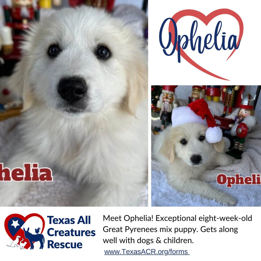 See Ophelia’s HomepageGo to our official website♥️ Meet Ophelia! ♥️ Ophelia is one of the beautiful pups from the “O” Litter, rescued alongside her mama and two siblings after being abandoned in rural Texas. Now safe and thriving, Ophelia is ready to find her forever family! As a Great Pyrenees mix, Ophelia is destined to grow into a big, fluffy beauty with a heart full of love. This breed is celebrated for their gentle, loyal nature, making them excellent companions, especially for families with children. Ophelia is available for pre-adoption and will be ready to join her forever home on November 23, 2024. Is your family ready to welcome this sweet girl into your hearts? ♥️ To apply for Ophelia: TexasACR.org We are a non-profit 501c3 Animal Rescue located in Dallas/Fort Worth, Texas. Our passion is centered around assisting animals that have been abandoned, neglected, or abused. We are a foster-based rescue consisting of 100% volunteers. If you are interested in becoming a foster, please email info@TexasACR.org