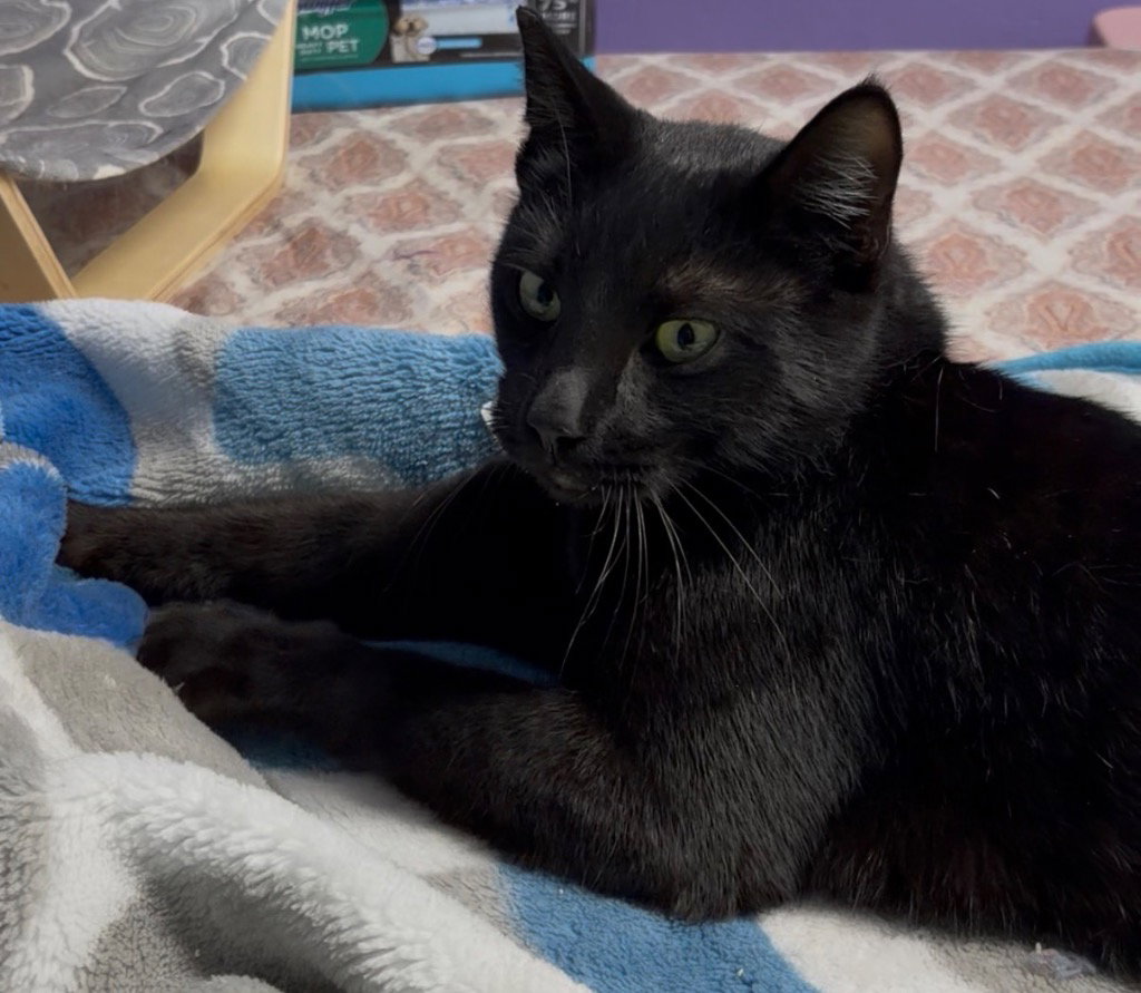 Panther is a big ole handsome man! Once you earn his trust, (which doesn’t take long) he is a huge lover! He will make you endless biscuits and drool out of happiness. He may get startled with too much comotion but his personality overall is great. He LOVES crunchy treats his current favorite is Blue Buffalo Tastefulls crunchy treats. Panther was supposed to be a barn kitty but he quickly decided that people are awesome and he is obsessed with the comfort of indoor life and biscuit making. He is great with other cats and loves to have another cat or multiple cat buddies. Panther got his name because he truly looks like a house panther.He is fixed, microchipped, vaccinated, FELV/FIV tested – negative, and treated for parasites.If you are interested in adopting, please fill out an adoption application.