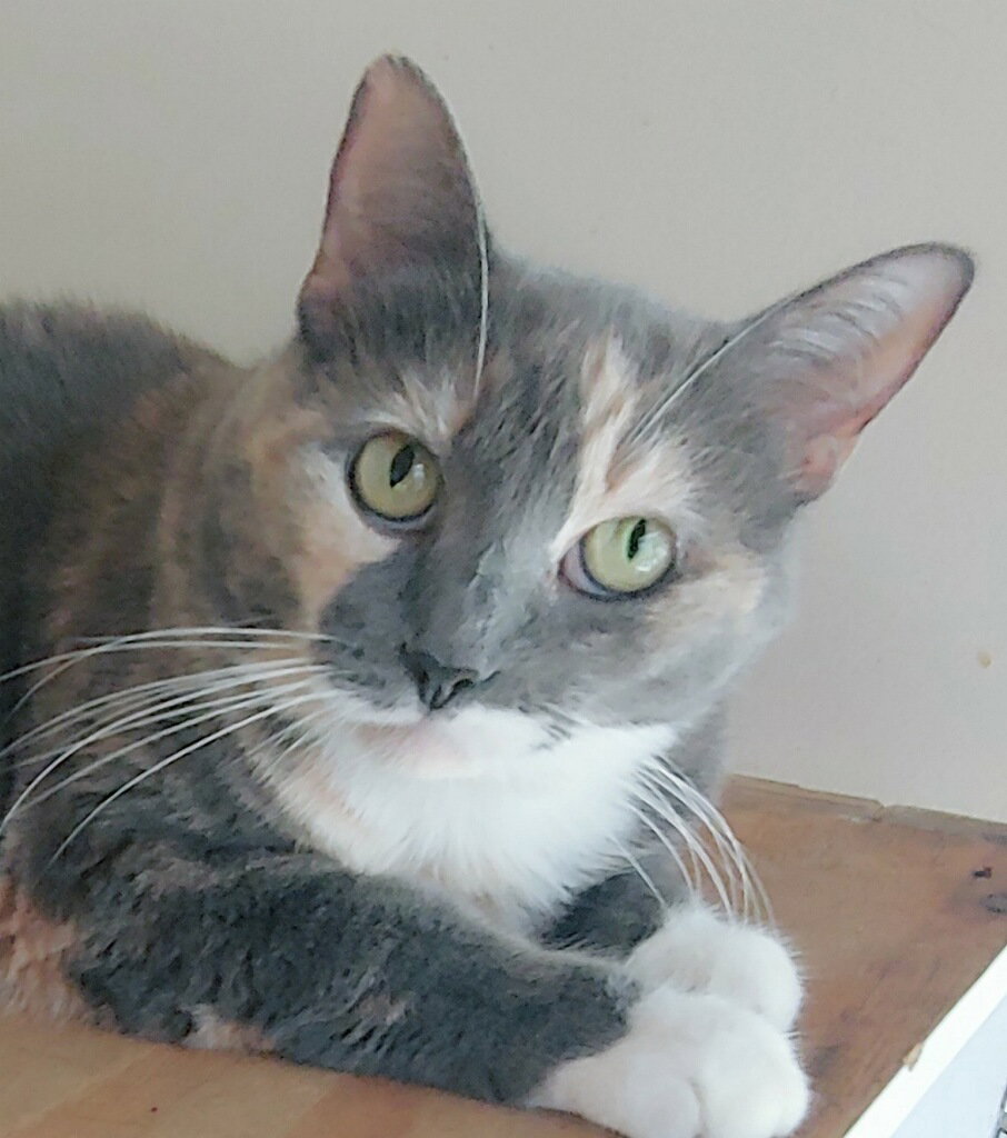 08/05/2024 – Meet Patches! Patches is a gorgeous diluted calico at about three years old. She loves laps and naps and cuddling.