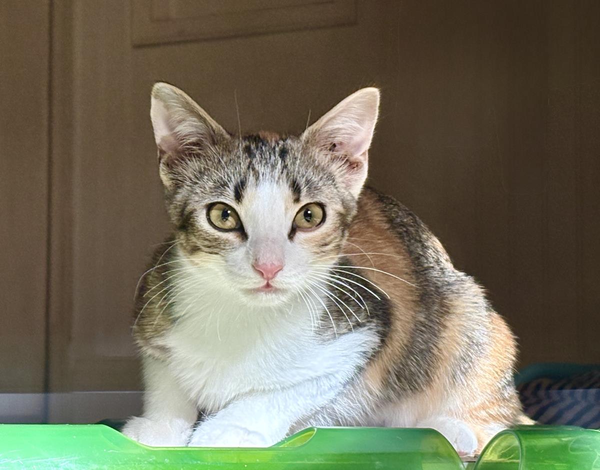 Date of birth: 8/18/2025 | Hi, I’m Pearl River – a total sweetheart with a soft spot for people and a purr that turns on the moment I feel safe. I adore humans and all the love they bring, but I’ll admit it: new places make me a little nervous. I might hide or take a moment to observe from a safe spot at first. But once I realize everything’s okay (which doesn’t take long!), I blossom into the snuggliest, happiest kitten you could ever meet. When I’m comfortable, I’m all about kneading on your lap, rolling over to show you my colorful calico belly, and curling up right against your chest while I purr the day away. I’m also playful – give me a toy, a sibling, or even a little fuzz ball, and I’m ready for fun! If you’re looking for a loving little companion who just needs a tiny bit of patience before she becomes your devoted, purry shadow, then I’m your girl. I can’t wait to find my purr-fect home to snuggle into! | Sociable with cats: Loves cats and requires a feline companion| Sociable with dogs: Unknown but optimistic ( has not met a dog) | Sociable with kids over 8| Health information: All cats and kittens are spayed and neutered, preventatively dewormed, and microchipped. In addition, they are FeLV/FIV tested and vaccinated as appropriate by age. | Interested in adopting? Apply to meet and adopt. | How to apply: please fill out application at https://www.savingonelife.org/adopt/apply/
