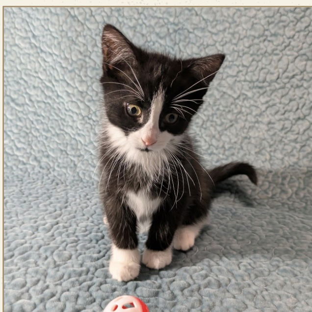 Meet Penelope, a beautiful short-haired kitten with striking black-and-white markings and the most endearing little goatee under her chin. Penelope is a gentle, affectionate girl who loves soft pats and quiet moments spent near her favorite people. While she isn’t a big fan of being picked up, she happily shows her love by staying close, purring contentedly as you give her the attention she enjoys. Playful, sweet, and wonderfully companionable in her own way, Penelope would make a wonderful addition to a home that appreciates a kitten who bonds through trust, closeness, and gentle affection. Siblings: Milburn, Mittens, Boots, Patches, Oreo, Stitch