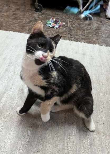 Penne pasta is about a year old. She and her sibling Fanta came from a bad situation, but she is doing great in foster care. She gets along with other cats and will purr just being around you. She also gets along with dogs. She loves to play and eat her treats and will follow you around like a dog. She is up to date with all her vaccines and is spayed. She will need to be on a special food until the ulcer on her lip clears up due to the bad situation that she came from.