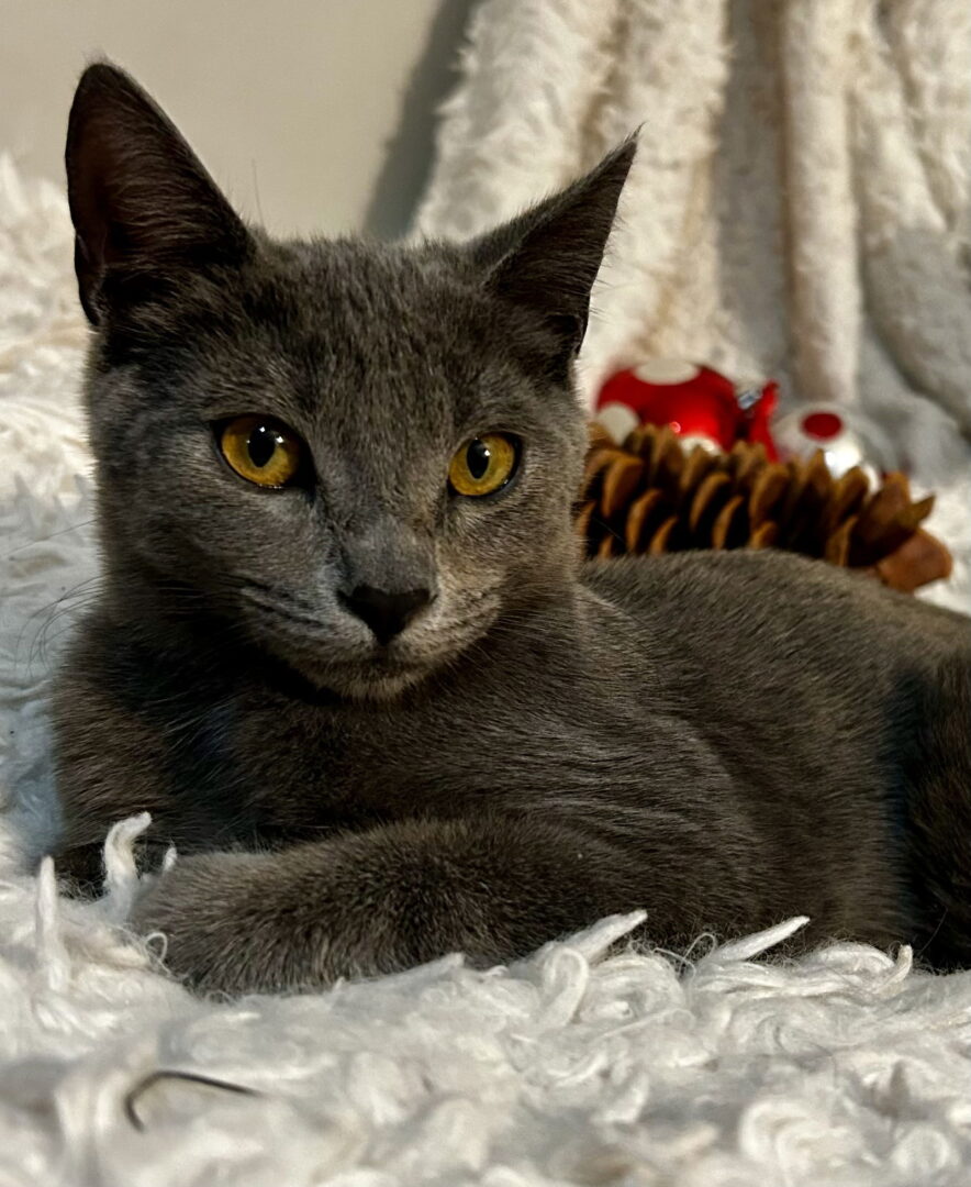 Meet Pennie Beautiful Penny is a four month old Russian blue female. This gorgeous girl has huge copper colored eyes and a sugar, sweet temperament! Her fur is so soft and velvety it is a pure delight to experience. Pennie is a petite girl, but her purrs are very loud and if you’re looking for a pair, she really enjoys her twin sister Sheba! She was raised with five other siblings. Adoption fee $300