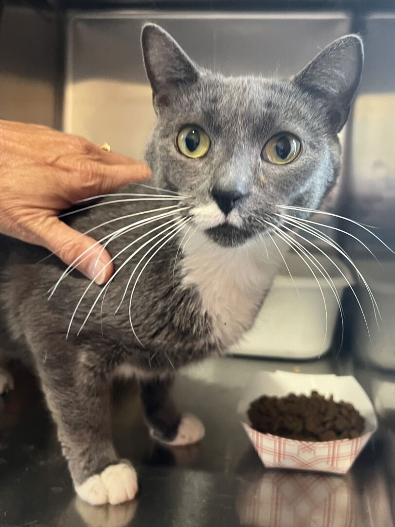 Foster Requested!!! Meet sleek, velvety Penny! Penny is a relaxed, friendly, outgoing girl. She is comfortable with human friends both old and new. Penny has soft gray fur with cute white paws, a white tuxedo and an adorable white partial mustache! Penny is “pretty as a penny” and she just can’t wait to find a home of her own. Be sure to watch Penny’s video. Here is her video: https ://www.youtube.com/shorts/X_O1H0CwBrQ . Please submit our no-obligation Adoption Application for a meet and greet or to adopt: https://forgottencats.org/adoption-application/. Not ready to adopt? Please consider fostering: https://forgottencats.org/foster-a-cat/. Thank you! (Foster: Trainer)
