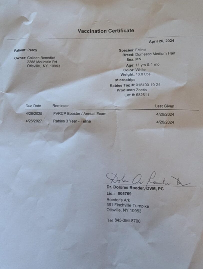 9/924 TARA MICROCHIP IMPLANTATION, BLOOD DRAW (FELV/NEGATIVE,FIV/NEGATIVE, Witness test by Zoetis 4/26/25 FVRCP Booster and Annual Exam 4/26/25 Rabies Vaccine 3 Yrs.