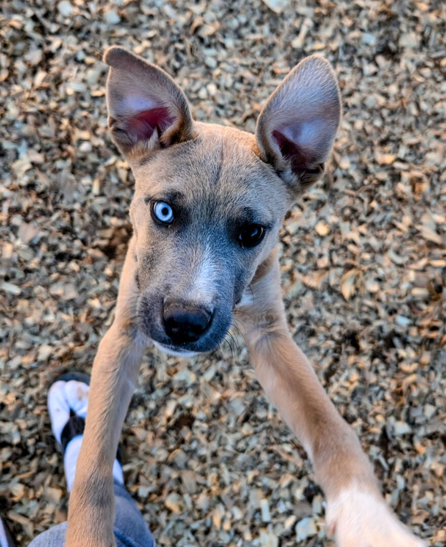 PETEY was born Aug 18, 2024 (3 months old). He is a male puppy, very sweet, has beautiful eyes — one blue and one brown. His ears may eventually stand up (they’re trying, he’s still young ;-) He has a beautiful disposition – we currently have him in a playgroup with a blind/deaf dog, a paralyzed dog in a wheelchair, and a mid-sized very active dog — he loves them all and they love him. Good with cats as well. He loves to hang out with humans and be petted and hugged :-) His adoption fee includes his neutering, vaccines, deworming and microchip. He was born on one of the reservations we work with Aug. 18, 2024. Application process: online app, ph/zoom call, pics/video, we bring the animal to you and help with introductions :-)Please email DesertPawsNM@gmail.com first to make sure the animal is still available. We look forward to you having a new forever family member! DesertPawsNM.org
