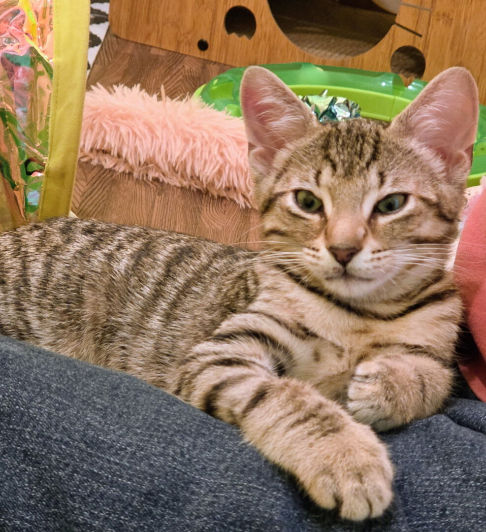 Skittles, Rolo, Snickers, Pez and Twix are adorable kittens who were born 7/19/2025. They are typical playful, purring, fun kittens. All have been in a home with children amd a small dog
