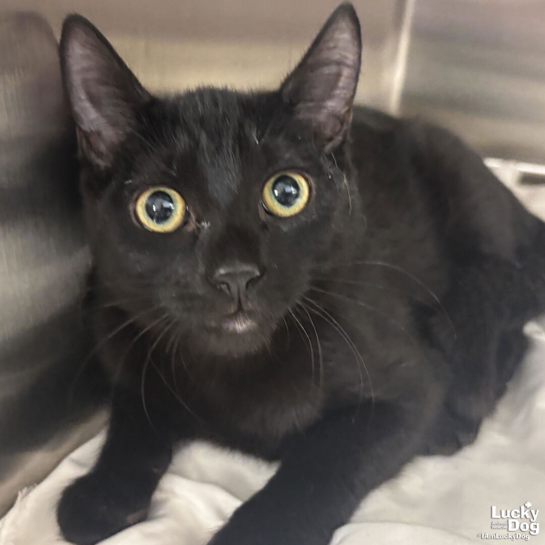 Please contact Lauren McCarty (laurenmc@luckydoganimalrescue.org) for more information about this pet.Mini panther Phee looking for her forever family!PHEE NEEDS A FOREVER HOME! Name: Phee Best Guess for Breed: Domestic Short Hair Age: 5 months as of 1/3/25 DOB: 8/3/24 SEX: Female Approximate Weight: 4lbs 12 oz Coloring: Black Type of Hair: Short Litter: Chauncey, Theo, Sal, Zoe, Phee Gets Along With: With proper integration, Phee will likely get along with other cats, dogs and kids with an acclimation period. We’re happy to help with tips and tricks! Currently Living at: Shelter…coming to DC area soon! I am Looking For: My loving forever family! Hi! I’m Phee, and I am a cute little kitty! I won’t ask for much- just some love, cuddles and lots of toys so I can run and play and be my kitty self. TO ADOPT: The adoption fee for adult cats is $200 ($350 for two cats adopted together). The adoption fee for a kitten (under 7 months old) is $220 ($380 for two kittens adopted together).If you are interested in adopting, please complete the Adoption Questionnaire online at bit.ly/adoptaluckycat. Lucky Dog Animal Rescue does our best to provide accurate information about the cats we have for adoption. That said, we cannot make any guarantees about age, breed or temperament. Thank you for contacting Lucky Dog Animal Rescue and helping to save a life! Please visit us online at www.luckydoganimalrescue.org . BE A FOSTER!!! Fosters make it possible for Lucky Dog Animal Rescue to save and care for homeless and abandoned dogs! To learn about fostering, please contact fostering@luckydoganimalrescue.org BE A SPONSOR!!!! Sponsors help Lucky Dog support the many dogs we save. To learn more about sponsorship, please contact info@luckydoganimalrescue.org !