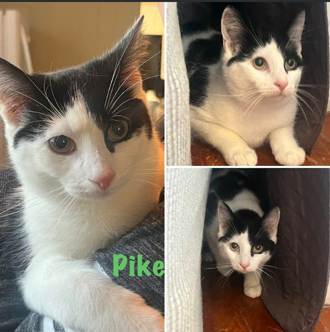 Birthdays: July 16, 2025 Anyone would be over the moon finding seven cute kittens, but not everything is all sunshine and rainbows. Pike and Maggie were two of the seven kittens found in this situation. They had a rough start, but they were lucky enough to be happy and healthy. Now they're just searching for a human companion to join their little group! They'd be happy with anyone as long as they have each other. Pike is the mostly white kitty with the black patch over his left eye. He's a happy go lucky, playful little guy, who loves to climb and sleep on top of his foster's rolled-up carpet! He’s energetic and sweet, and he would love to have a place on your sofa! Maggie is the kitty who has darker patches going over her right eye. She's also sporting a fashionable chin guard! As sweet as she is, she's more quiet and sensitive than her brother. She loves to play, but she has more independence. She will melt in your lap and purr the day away! Her favorite person is her cuddle-brother Pike! Pike and Maggie's adoption donation is $245 and includes age-appropriate vaccines, dewormer, flea treatment, Felv/FIV testing, microchip, and neuter. If you would like more information on them, please contact Renee at lovingcarecatrescue@gmail.com. If you would like to fill out an online application, please visit https://lovingcarecatrescue.org/adopt/adoption-application/ Please note: LCCR does not allow our adopted cats and kittens to be declawed. All adopted kitties are to be kept as indoor-only pets.If you are interested in adopting this kitty, please fill out the online application at https://alovingcarecatrescue.org/adoptionapplication.html
