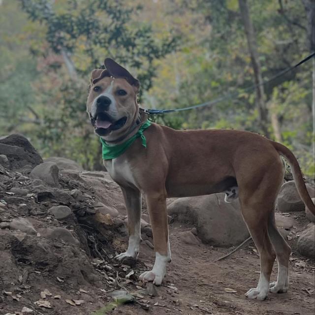 Meet Pilot — a young Pit Bull (German Shephard?) mix who is smart, affectionate and looking for a best friend.Training? Pilot is fully potty trained and has mastered commands like come, sit, wait, up, down, bed, drop and leave it. He’s got loose leash walking down in boring places and is working on his leash skills with distractions.Pilot loves other dogs and would make a fantastic little brother. Pilot does extremely well with dogs of all sizes and ages by matching their energy and respecting corrections. He is happy to let friends chase him, chase them, play wrestle-mania or just stand around eating grass.This sweet boy is intelligent, curious, affectionate and a great cuddle buddy. He loves to play and interact with adults and kids, soaking up every bit of attention he can get. He is the only dog in his foster home and does well when given a routine and commands to help him understand what is expected of him. As a young pup, he still chooses mischief at times to get attention so his new family should have dedicated time to continue his training or have a doggy sibling to keep him company and show him the ropes as he matures.