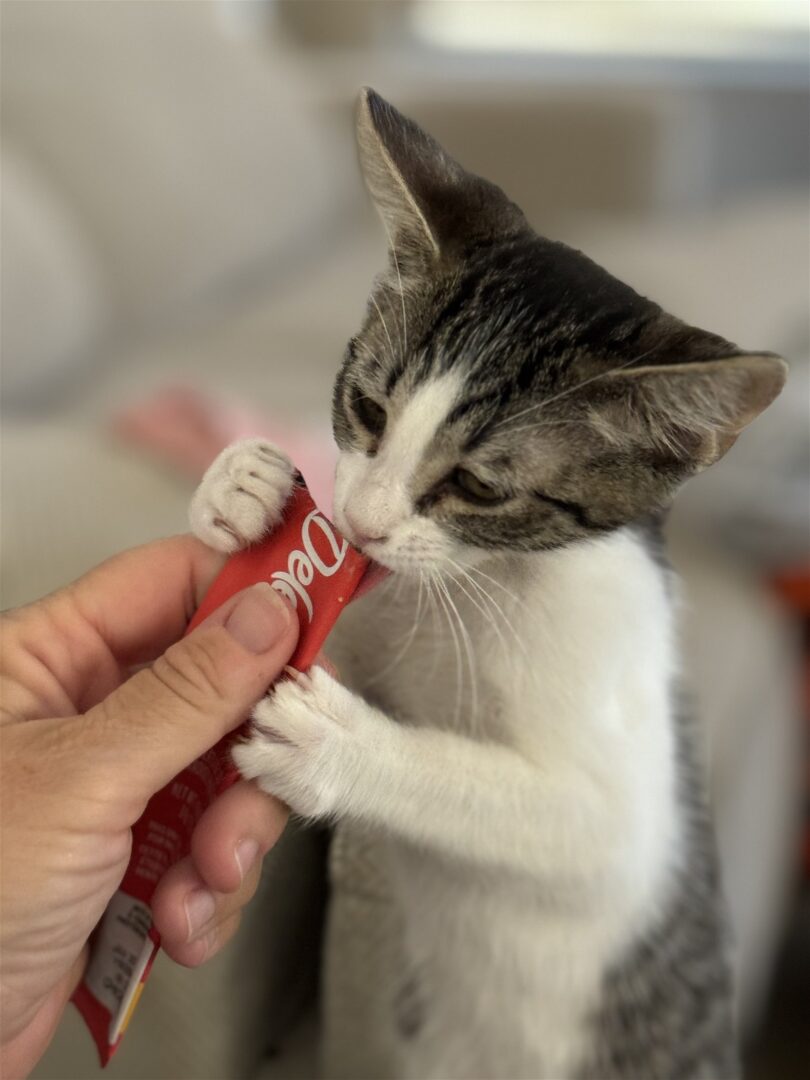 See Piper aka Cat Girl’s HomepageGo to our official websiteYou can fill out an adoption application online on our official website.Hi, I’m Piper. I was found abandoned in a dumpster by a couple that had previously adopted from RAIN rescue. I was so little when they found me they reached out for help to ensure I got the medical care and emotional support I needed to thrive. Now those first few scary weeks are behind me and I have discovered how great life, and people, can be. I live with other cats, big dogs and kids and I love them all! My favorite ways to pass time are playing with other kittens, snuggling, and making biscuits on a soft blanket. My favorite treats are lick sticks – I can smell them a room away and pop up out of nowhere to enjoy a snack. If you have a lot of love in your heart, soft blankets for me to make biscuits and some lick treats, I would definitely like to meet you and consider you to be my forever family. I am young with energy so I need another cat in the home. Fill out an app if you think you’re the one for me! Our adoption fee is $175 If you are interested in adopting, please complete the Cat Interest Form on AZRAIN.ORG and, if you are selected as a prospective adopter, we will contact you to set up a meet and greet. Thank you for considering rescuing an animal in need!