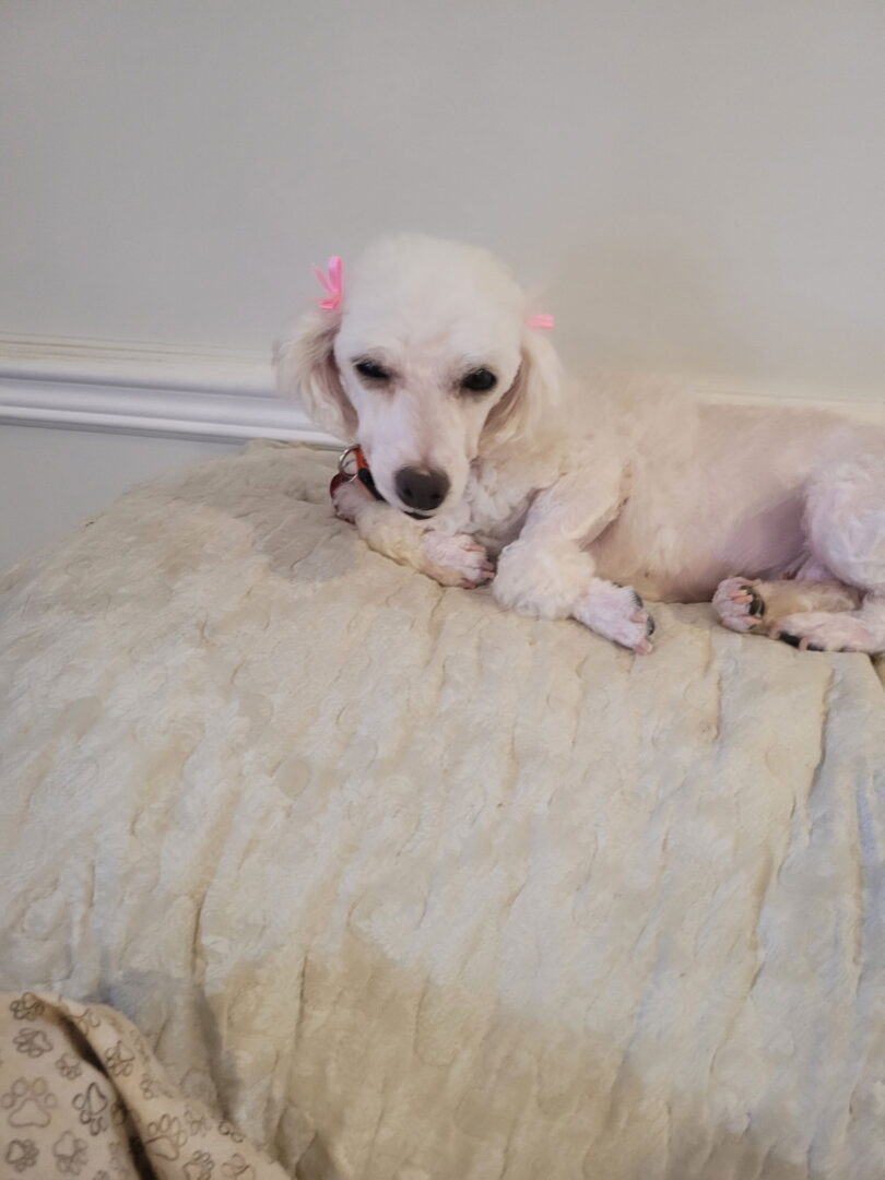 Pippy is an approximately 8-10 year old mini poodle who was found by a local animal control officer after being called out to investigate. It's likely she escaped or was let loose from a nearby puppy mill. She is a lovely sweet dog but remains traumatized from her years in the mill and can be skittish. Pippy is good with other dogs, pee pad trained, initially vocal when left alone but not destructive. She does not yet walk on a leash and is a flight risk, so someone with a backyard would be essential. They can practice walking on a leash with her before she goes "free style" as she would definitely bolt if her collar or harness malfunctioned or became loose. She will need work on housetraining. The foster parents have managed to get her pee pad trained and next is outside training but due to the winter weather their yard has not been available (but it is now). She is fully vetted including a dental surgery