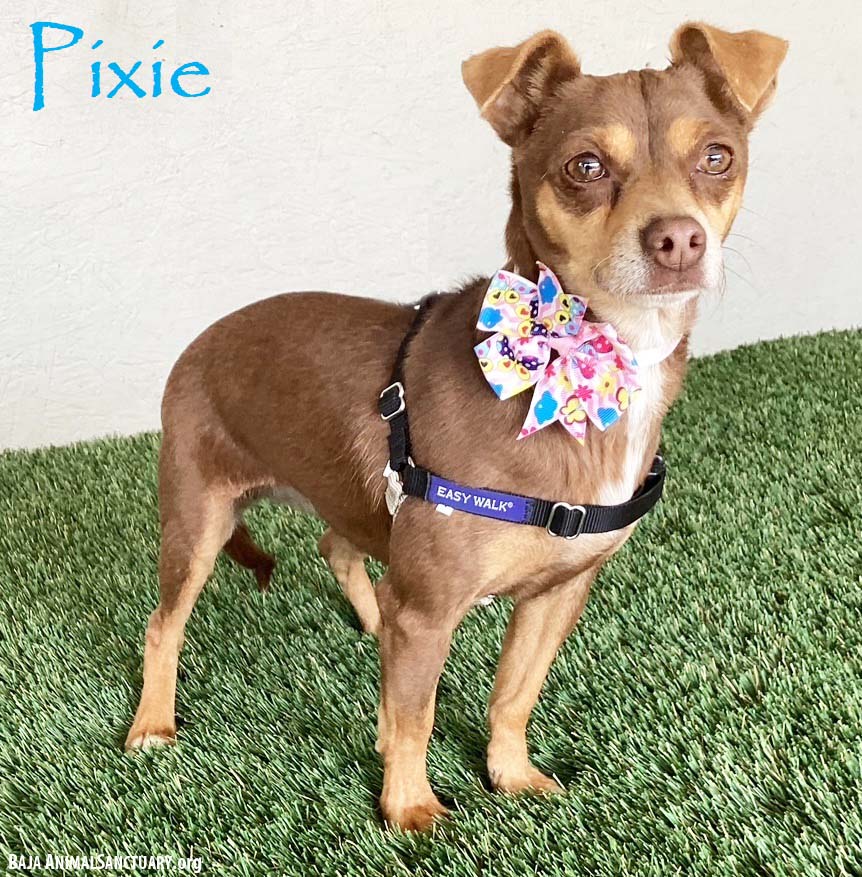 Pixie is 2 years old and weighs 10 lbs. She’s active, friendly with people, and social with other dogs. Pixie is a stray rescue. She was found in Tijuana by one of our volunteers. If you would like to meet this dog you can read about our adoption process and submit an application on our website at: http://www.bajaanimalsanctuary.org/dogs.htm