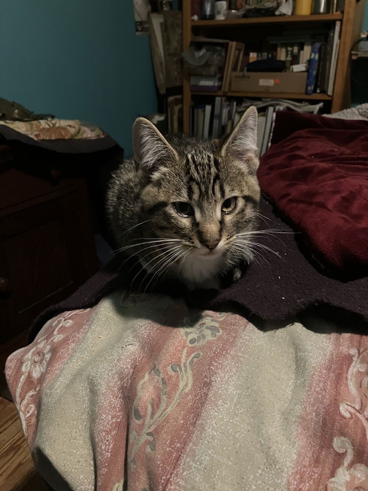 Pooka is a handsome 3.5 month old mackerel boy tabby.Heis an all-round great kitten, full of play, love and purrs VERY loudly. He's the bravest of the litter, thefirstto stare-down the vacuum cleaner, and refuse to move.He likes to cuddle with his siblings, has started to siting our laps forshortperiods.He's outgoing, and interested in thefoster's dog and consistently tries to engage the foster'scat in additional play. Raised underfoot. No exposure to children. All of our cats come spayed or neutered, microchipped, and with their initial age-appropriate vaccinations. Kittens have an adoption fee of $200 each or $300 for a bonded pair. Kittens must be adopted in pairs unless there is another young, energetic cat in the home. If you would like to apply to be a forever home for this cat, please fill out a statement of interest at www.alternativehumanesociety.com. Unless otherwise indicated, all our cats and kittens are best suited for indoor-only life.