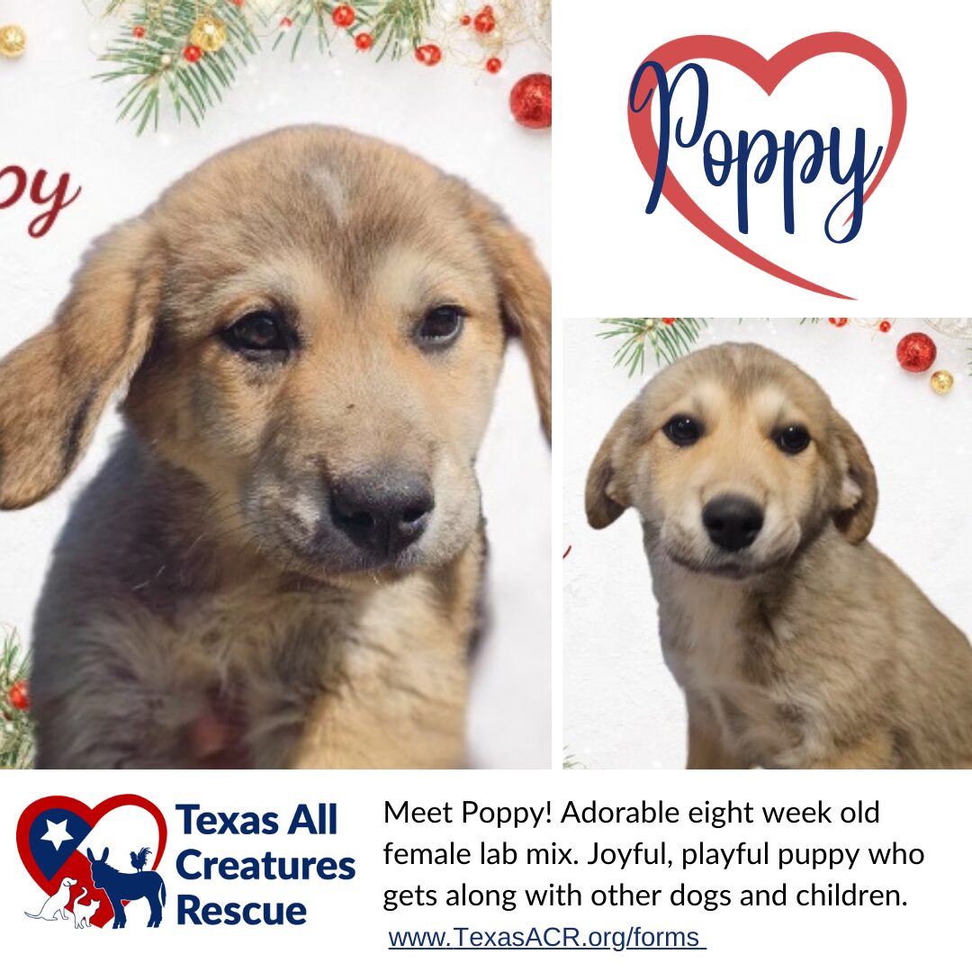 See Poppy’s HomepageGo to our official website Meet Poppy, Our Holiday Treasure! This 8-week-old sweetheart is ready to bring warmth and love to your home this holiday season! Poppy is our quiet, steady girl who loves nothing more than cuddles and being close to her humans. Her favorite things are cozy naps and spending time indoors with the family. She’s the perfect companion for snuggling up on chilly winter nights or relaxing by the fire. Poppy is one of three sisters we rescued through our community outreach program. Born on the streets to a stray mom, she’s now safe, thriving, and looking for her forever home just in time for the holidays. Her story is a reminder of the importance of spaying and neutering our pets. Together, we can prevent unwanted litters and give every animal the gift of a brighter future. Fill out an adoption application today to make Poppy part of your family and your holiday memories! TexasACR.org #HolidayTreasure #SpayAndNeuter #TexasACR #ForeverHomeForTheHolidays We are a non-profit 501c3 Animal Rescue located in Dallas/Fort Worth, Texas. Our passion is centered around assisting animals that have been abandoned, neglected, or abused. We are a foster-based rescue consisting of 100% volunteers. If you are interested in becoming a foster, please email info@TexasACR.org