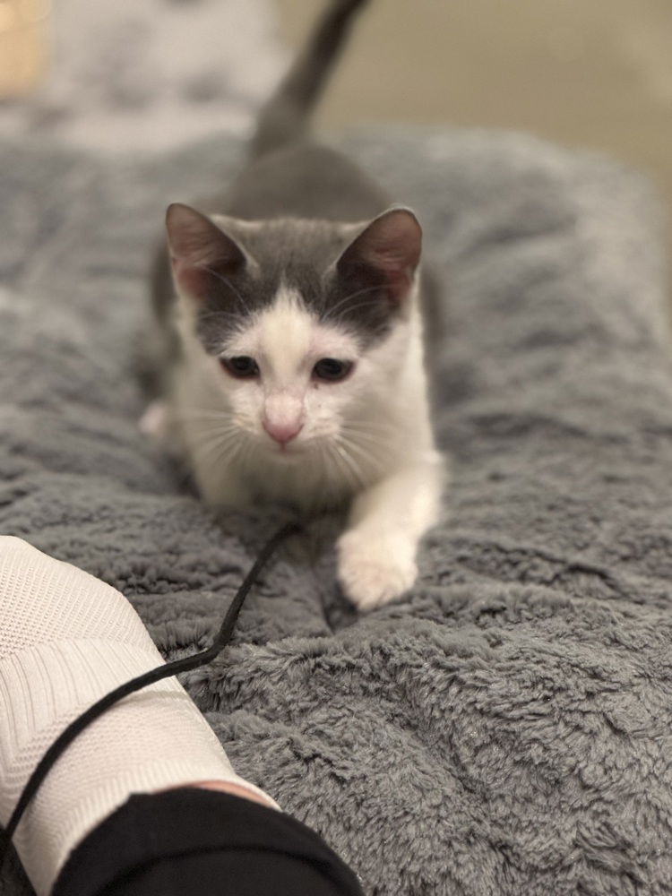 Meet Presley, a kitten who's got personality in spades. This little one is the epitome of cuddly, always seeking out a warm lap to nestle into. Her playful antics are sure to keep you entertained, as she chases after shadows and pounces on invisible foes. Presley has a knack for making you laugh, her funny little quirks brightening even the gloomiest of days. She's a talkative little thing, with a purr that's like music to the ears. Presley's purr machine never seems to stop, a soothing rumble that's the perfect soundtrack to a quiet evening at home. Despite her young age, Presley has a lot of love to give. Adopting Presley means opening your home to a bundle of joy that will fill your days with laughter, play, and endless cuddles.