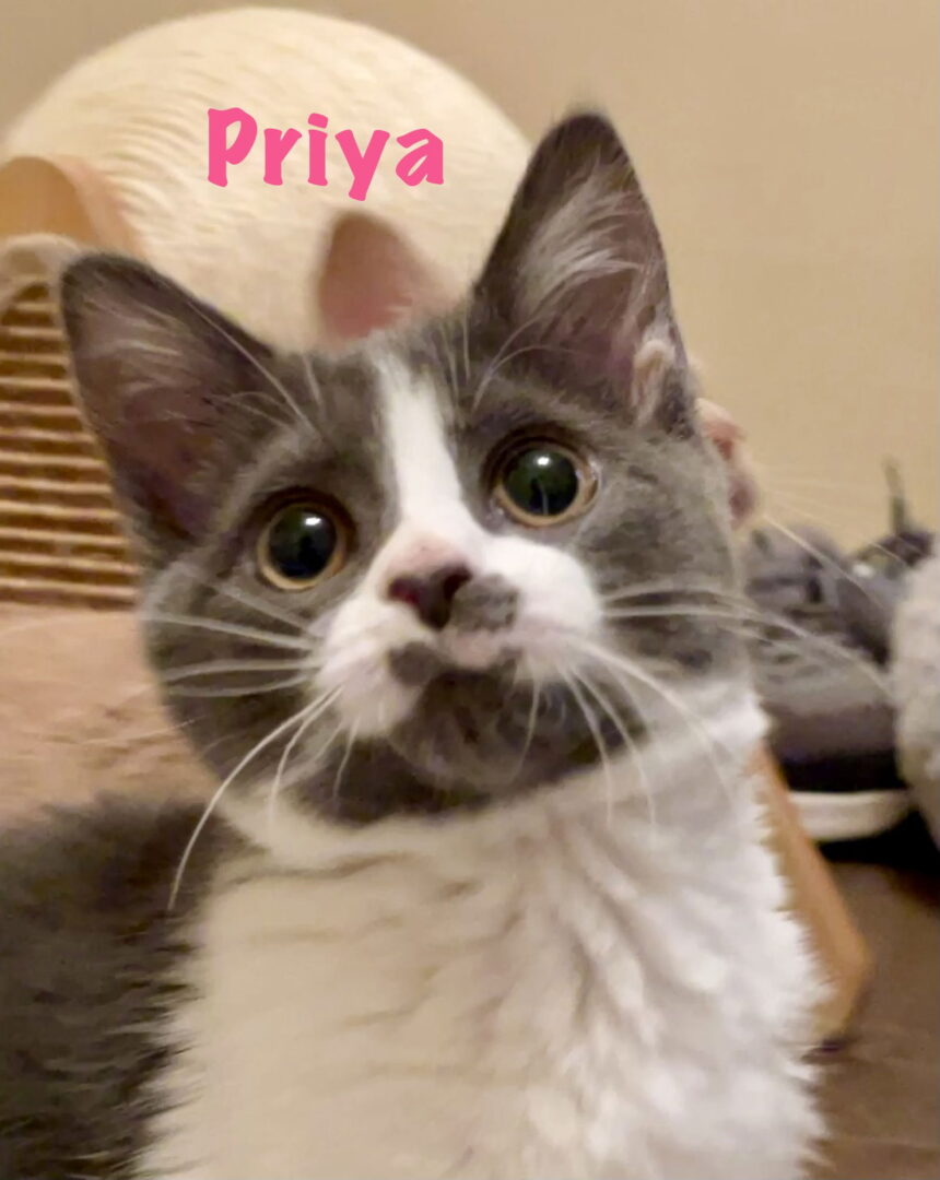 See Priya Star’s HomepageGo to our official websiteLights, camera, purr! Introducing Priya Star, the dazzling grey-and-white heroine straight out of a Bollywood dream! With eyes that sparkle like stage lights and a purr that plays like a love song, she’s the full package – beauty, grace, and a little bit of dramatic flair. One moment she’s the sweet romantic, curled in your lap, and the next she’s the energetic star of an action scene, leaping after her toys with dazzling precision. Priya’s charm wins everyone over – she loves her sisters, adores her human fans, and never misses a chance to steal the spotlight (and your heart). There’s no need for makeup or costumes – her natural glow and affectionate spirit make her a true leading lady. At 4 months old, Priya is ready for her forever home debut, bringing song, sparkle, and snuggles to her next big love story. Roll out the red carpet – your little superstar has arrived! Interested in this Little Buddy? For the fastest response, please call our Adoption Coordinator at 703-431-5931 and leave a voicemail with your name, number and name(s) of the Little Buddy(s) you are interested in learning more about. Our Adoption Coordinator will return your call in 24-48 hours. Calls will be returned in the order they are received. Please only call once and remember to leave a detailed voicemail. Our adoption fee is $190 for a cat or kitten. This includes spay/neuter, microchipping, combo testing, age-appropriate vaccinations, deworming, flea treatment and any necessary medical care prior to adoption.