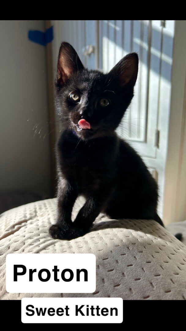 Proton is a 10 week old (as of 3/25/25) black male kitten. Although he is a little smaller than his three brothers, he has no trouble keeping up with them. He has a good appetite and races his brother Electron to be first to the food bowl. When nap time comes, Proton loves to curl up against one of his humans for some belly rubs and then purrs himself to sleep. Proton and his 3 brothers, Electron (FCID # 03/25/25-126, adopted), Molecule (FCID #03/25/25-127) and Neutron (FCID #03/25/2025-129, adopted) has just moved from foster care to the Willow Grove Adoption Center. He would be happiest if adopted with one of his brothers or with another young kitten. Proton is litter box trained, neutered, and up to date on vaccines. He gets along well with children and with other cats. Although he has not met a dog yet, he would likely be fine with a proper introduction. Proton is ready for his furr-ever home. How about yours? Proton is playing at our Willow Grove PetSmart adoption center. Submit a no-obligation application to adopt today: https://forgottencats.org/adoption-application/ (Foster: Shirley G.).