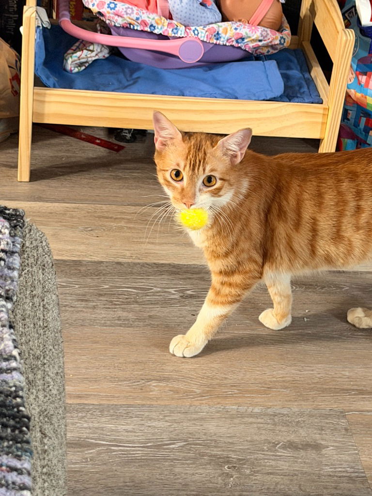 Hello my name is Pumpkin and I am a male kitty who was born in July, 2024. I am very playful and like playing with my siblings. I like toys and climbing the cat tree. I am getting use to being around big dogs. You can apply to meet/adopt me or any of my siblings at www.tinyurl.com/ccapadoptionsTo inquire about adopting this cat please complete an adoption application at tinyurl.com/ccapadoptions Once you submit an adoption application, a foster will reach out within 48 hours to schedule a meet-and-greet or ask any additional questions. If you haven’t heard back within that time, please contact **adoptions@sanantonioferalcats.org** so we can follow up. If the cat you’re interested in isn’t listed in the dropdown menu, it may be pending adoption or recently adopted, but the website hasn’t been updated yet. Feel free to email us for confirmation. Thank you for choosing to adopt one of our amazing cats!