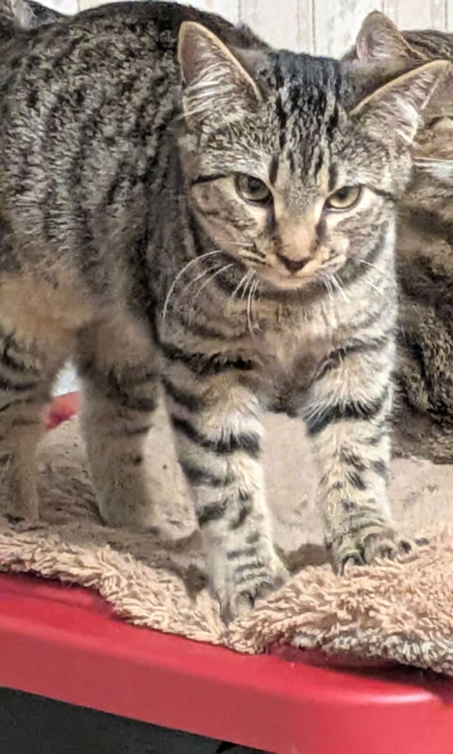 Hey there, I’m Purrvana — the feline embodiment of peace, play, and just a hint of chaos. I’m a playful spirit with a rock ’n’ roll heart, sometimes a lap cat, sometimes a zooming blur of fur — it really depends on my mood (and how comfy your lap looks). I get along well with other cats and tolerate dogs… as long as they respect my artistic process. I’m chill, fun, and guaranteed to bring a little enlightenment (and maybe a few hairballs) into your life. Adopt me and achieve true Purrvana — no meditation required. Purrvana =^..^=, DSH Brown Tabby, Female, DOB 7/12/2025 https://cataroundtownproject.org/adoption-application/
