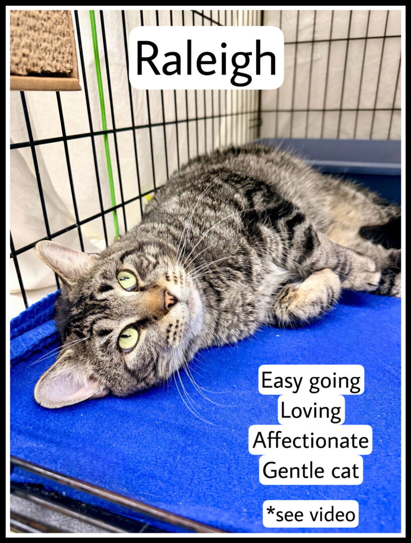 Meet Raleigh! Raleigh is a handsome young silver and black tabby with striking golden-green eyes and the gentlest demeanor. He has a truly loving soul. While he may be a bit reserved at first, it doesn’t take long for him to come out of his shell. Once he feels safe, Raleigh happily seeks affection—rolling over, purring, and soaking up every bit of love he’s offered. This love-bug is one in a million. He’s a sweet, gentle cat with a calm and affectionate nature, and he’s ready to find a forever home where he can feel secure and cherished. Raleigh should be fine with gentle children, and he appears to be fine with cats as well. Please check out his video: https://www.youtube.com/shorts/VpQJxnTarWE . Please submit our no-obligation Adoption Application for a meet and greet or to adopt: https://forgottencats.org/adoption-application/. Not ready to adopt? Please consider fostering: https://forgottencats.org/foster-a-cat/. Thank you! (Foster: Willow Grove)