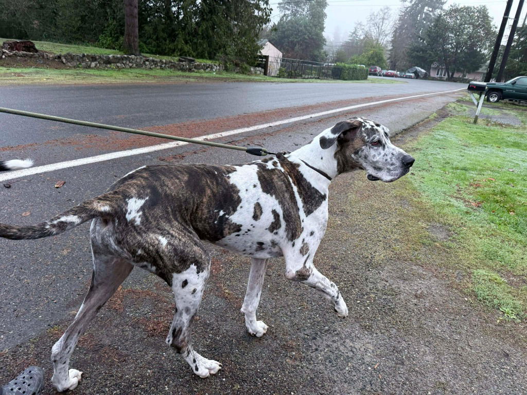 Location: Seattle, WA (adopter must be within 2–3 hours)DOB: 2/26/2021People love to comment on how big Great Danes are—but Ranger isn’t just big, he’s a GREAT DANE. Weighing in at an impressive 185 lbs and standing 38” at the shoulders, he’s a gentle giant through and through. The bigger the dog, the bigger the love, and Ranger is all about kisses, cuddles, and that classic Dane lean. Despite his size, he truly believes he’s a lap dog and will very gently perch himself right beside (or on) you.Ranger is generally calm and easygoing, with occasional playful moments. He loves his people and thrives on companionship. He enjoys regular walks, though he can get overly excited when he sees other dogs or squirrels—continued leash training and guidance with dog interactions will be important, as he’s a lot of dog when excitement kicks in.He has lived as an only dog but has done well with visiting dogs in his home. A meet-and-greet with any resident dogs would be required. Cats are unknown.Because Ranger loves being near his humans, he would do best in a home where someone works from home or has a hybrid schedule. Stairs are challenging for him, so a home with minimal stairs is strongly preferred.If you’re looking for a loyal, affectionate, larger-than-life companion who will happily lean into your heart (and your space), Ranger may be your perfect match. Apply today!https://forms.gle/G2dJx2NV4JXZcZ9F6Thank you for considering rescue! If you are interested please apply. Foster/Adoption Application: https://forms.gle/G2dJx2NV4JXZcZ9F6