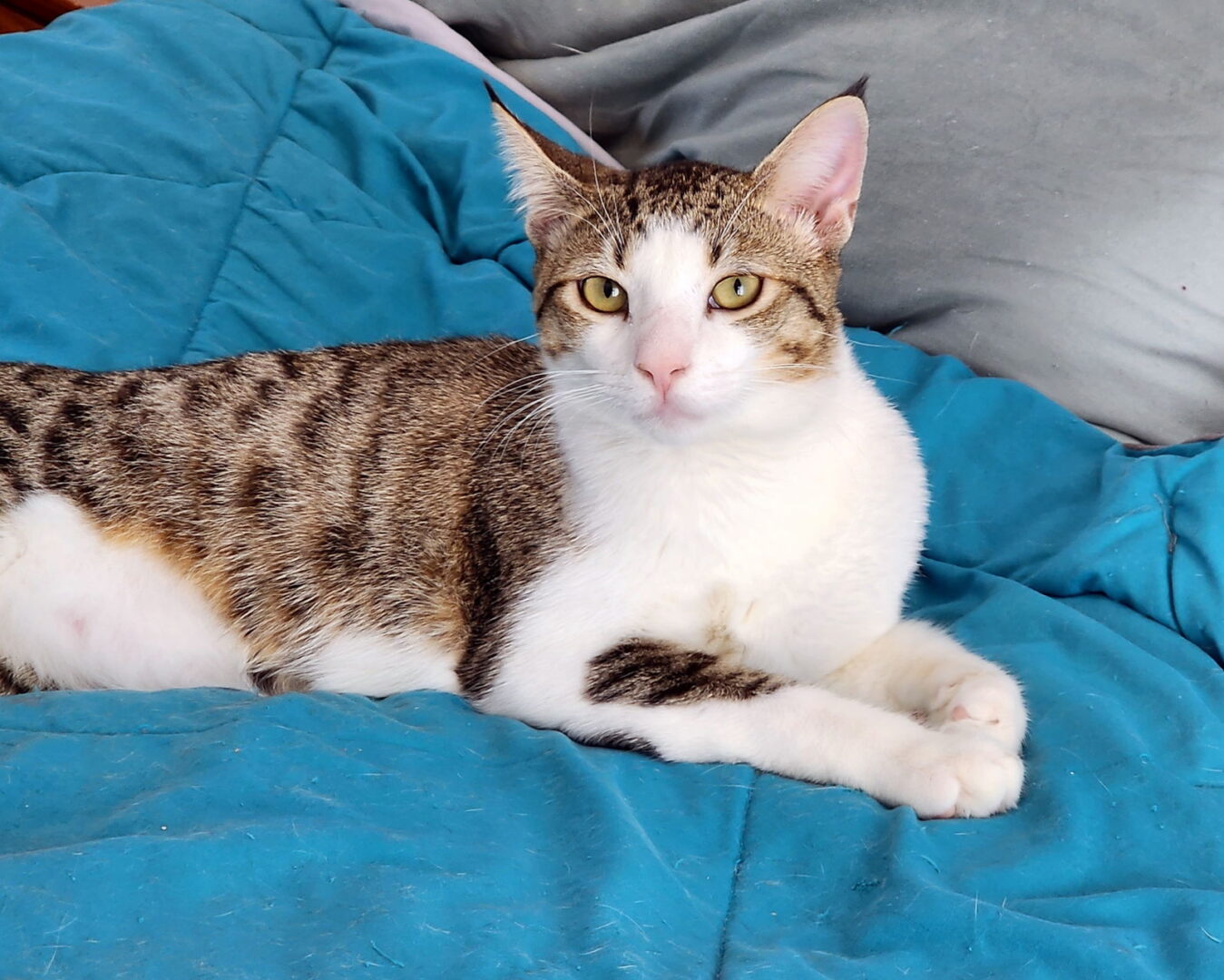 I am currently available for adoption at the Irvine Petco. If you’re interested in adopting me, fill out an application on our website www.carmaoc.org Hi! My name is Rayovac and I’m the shyest of my brothers. We all are skittish and take time to warm up to people so I need a patient home. Once I do know you, I can be very sweet and cuddly. When I cuddle, I like my head rubbed and tend to do twisties and elevator butt to get more pets. Sometimes I push my brothers out of the way to get attention. I love to lay next to you and purr. I also enjoy playing with toys and chasing my brothers. I have been fostered with other cats and dogs and get along with everyone. My adoption fee is $175. That includes spay/neuter, microchip, FIV/FeLV combo test, current vaccines and health check.