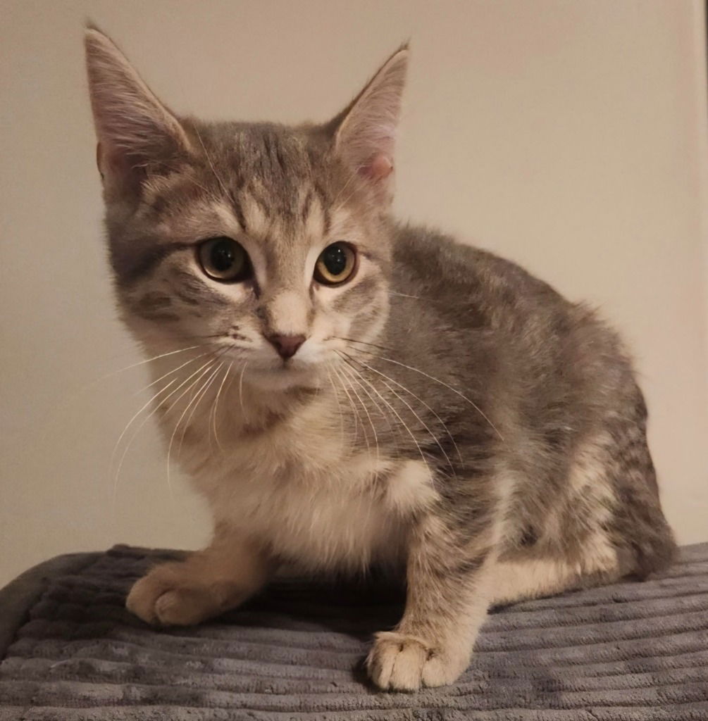 Hi, I am Razzy! I am a lively and bold little girl who loves to explore, climb, and zoom around the house. I am always on the move and full of excitement, just like my brother Nitro and my sister Peachy. I also have a funny habit of trying to share your people food if you are not watching closely. I think everything looks interesting.Even though I am a wild child, I turn into a soft and cuddly sweetheart when I start to feel sleepy. I love curling up with someone I trust and resting after a busy day of adventures.I would do well in a home with other active pets or humans who enjoy a playful and curious kitten. I get along fine with gentle dogs and with older kids who understand how to treat animals kindly. I have not spent time with very young children yet, so that is still new territory for me, but I may do well with little ones who are calm and respectful.If you are looking for a kitten who is full of personality, fun, and heart, I hope you will choose me. My name is Razzy, and I am ready for my forever family. If you are interested in adopting a CAWS pet, please fill out an online application at https://caws.org/adoption-application