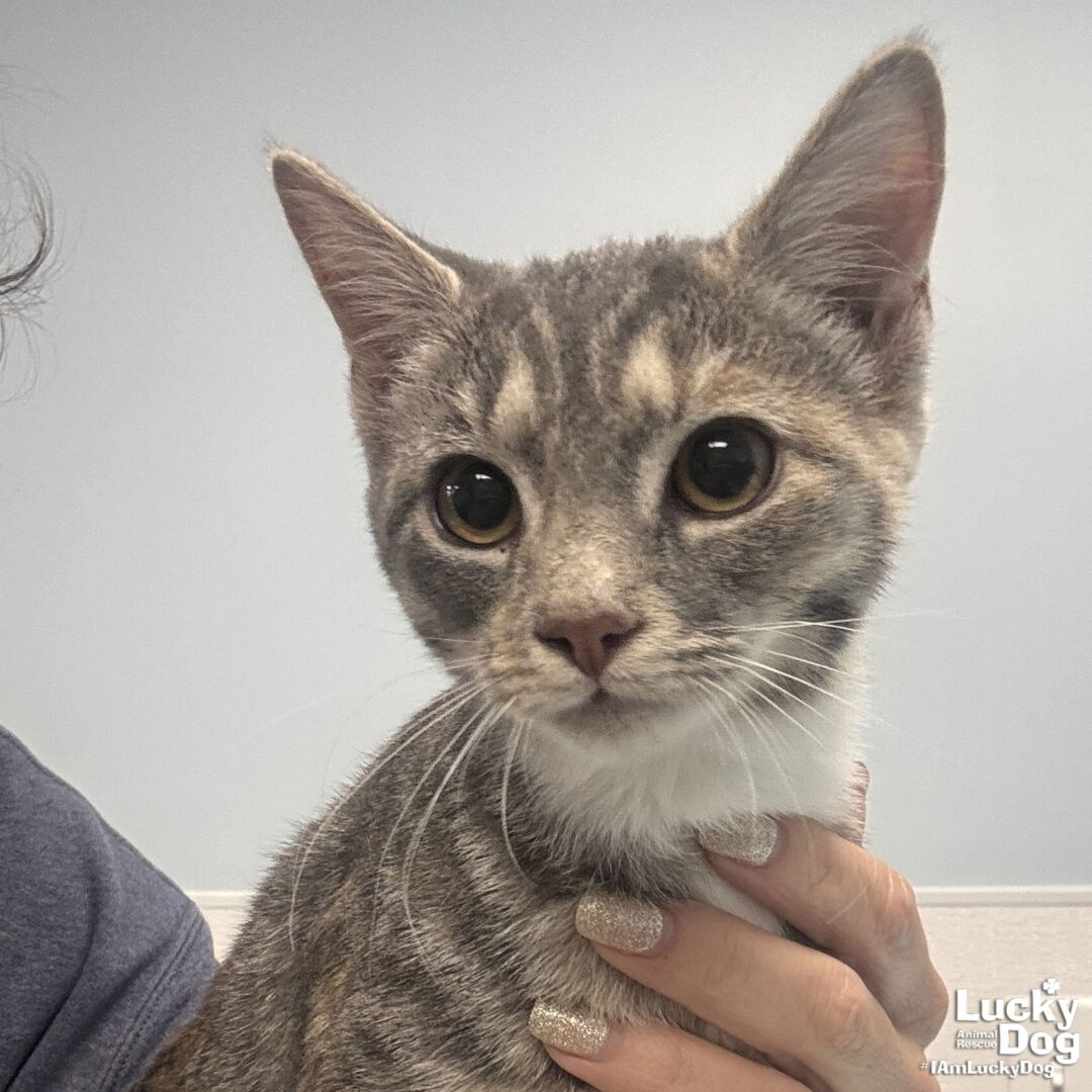 Please contact Lauren McCarty (laurenmc@luckydoganimalrescue.org) for more information about this pet.Sweet Regent is looking for a forever home!REGANT NEEDS A FOREVER HOME! Name: Regent Best Guess for Breed: Domestic Short Hair Age: 4 months a/o 12/20 – Estimated DOB 8/20/24 SEX: Female Approximate Weight: 5.5 lbs Coloring: Brown tabby Type of Hair: Short Litter: Regent, Rocky, Rowan, Randy Gets Along With: Because of her young age, Regent will likely get along with other cats, dogs and kids with an acclimation period. We’re happy to help with tips and tricks! I live with a dog in foster! Currently Living at: Shelter…coming to DC area soon I am Looking For: My loving forever family! Hi! I’m Regent, and I am a cute little kitten! I won’t ask for much- just some love, cuddles and lots of toys so I can run and play and be my kitten self. What My Foster Says About Me: coming soon! Kitten Vetting Requirements: Your kitten may not be fully vaccinated upon adoption. You will be responsible for providing whatever remaining vaccines are needed to complete the kitten vaccine series. TO ADOPT: The adoption fee for adult cats is $200 ($350 for two cats adopted together). The adoption fee for a kitten (under 7 months old) is $220 ($380 for two kittens adopted together).If you are interested in adopting, please complete the Adoption Questionnaire online at bit.ly/adoptaluckycat. Lucky Dog Animal Rescue does our best to provide accurate information about the cats we have for adoption. That said, we cannot make any guarantees about age, breed or temperament. Thank you for contacting Lucky Dog Animal Rescue and helping to save a life! Please visit us online at www.luckydoganimalrescue.org . BE A FOSTER!!! Fosters make it possible for Lucky Dog Animal Rescue to save and care for homeless and abandoned dogs! To learn about fostering, please contact fostering@luckydoganimalrescue.org BE A SPONSOR!!!! Sponsors help Lucky Dog support the many dogs we save. To learn more about sponsorship, please contact info@luckydoganimalrescue.org !