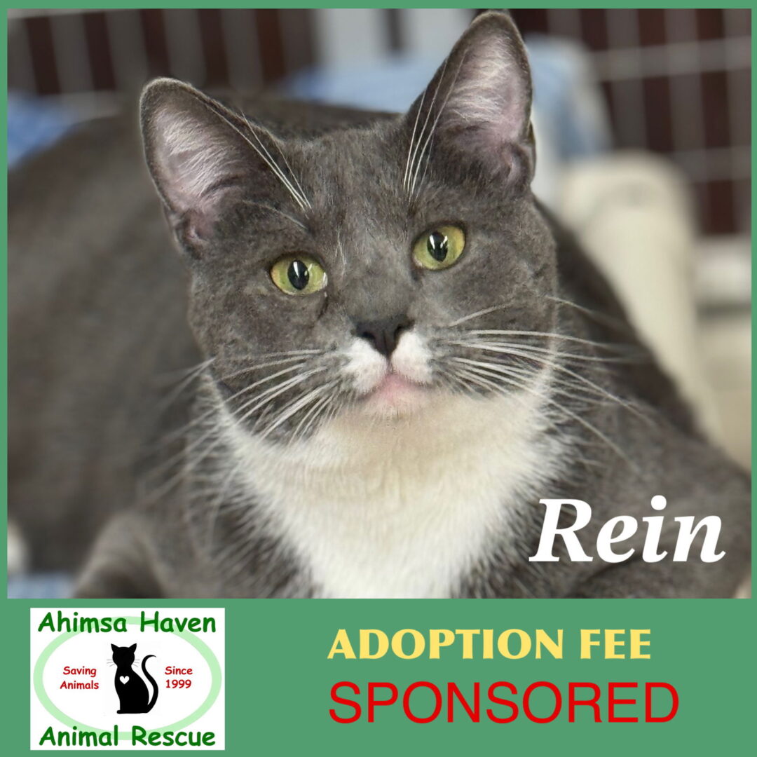 Rein is a 1.5 year old friendly, outgoing boy. He is high energy and needs a high energy cat friendly dog in the home. He can be somewhat feisty to his humans at times. So he needs a cat saavy person, no small children and no other cats. He tends to bully the cats. Rein is definitely a charmer and with a bit of “bad boy” in him. Rein’s adoption fee has been generously sponsored. If you are interested in adopting, applications can be found on our website www.ahimsahaven.org. Meet and greets are with an approved application by appointment only. As always, cats that are ready to be adopted are spayed/neutered, have age appropriate shots, are micro-chipped, dewormed/deflead, and FEL/FIV tested.
