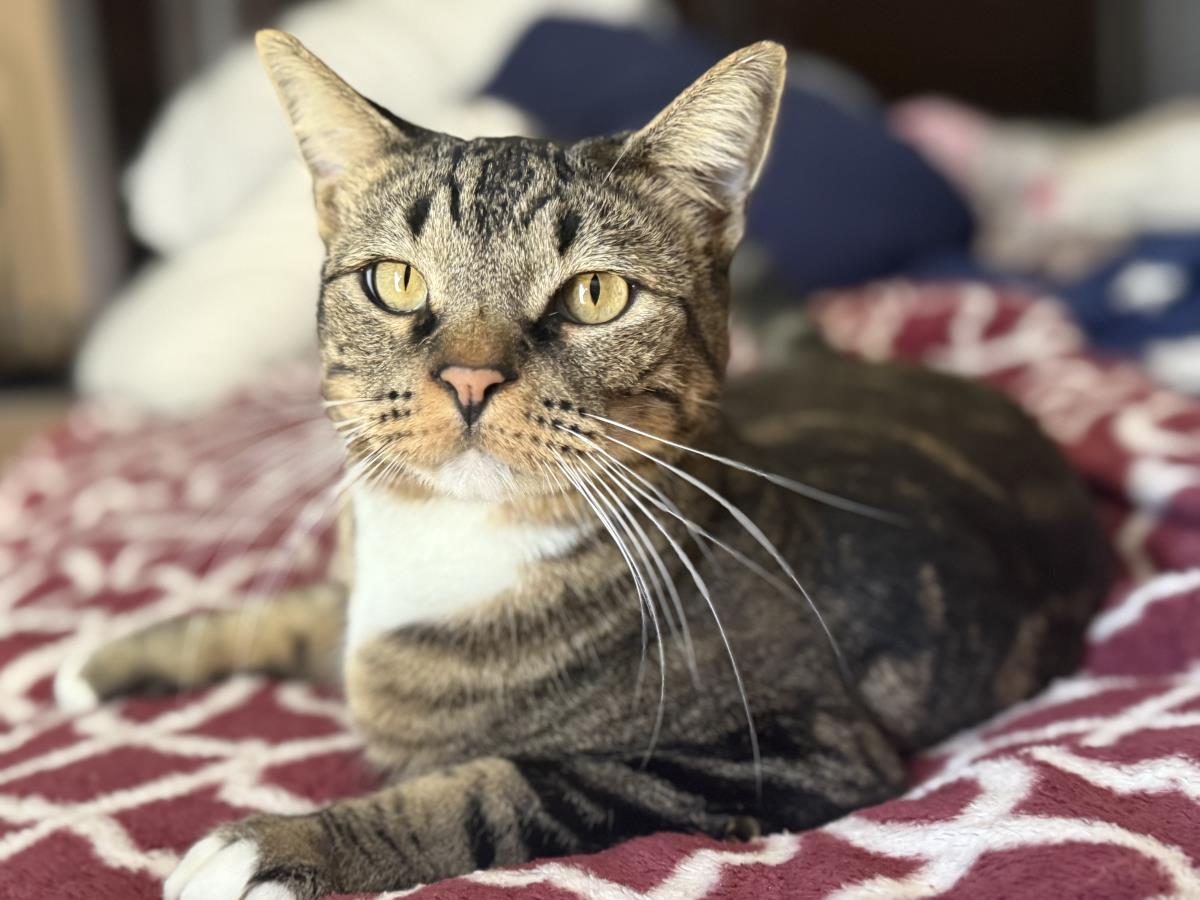 Approximate date of birth: 11/12/2021 | Remus Lupin is a purr machine, biscuit maker, and total velcro cat who adores his human. He meows the second he sees you and wants constant affection, he truly believes petting should be a full-time activity. If you stop for even a moment, he’ll remind you by climbing onto your shoulder to reclaim your attention! Remus loves spikey ball toys, fake mice, cuddles, and being as close to you as physically possible. He’s incredibly sweet, affectionate, and goofy, and will make the best companion for someone who wants a shadow kitty. He does give gentle love bites when he’s seeking attention. Remus is ready for his forever person, someone who will adore all his sweet, silly, snuggly ways. | Sociable with cats: Likes with proper introduction. | Sociable with dogs: Unknown but optimistic (has not met a dog). | Sociable with kids over 5.| Health information: All cats and kittens are spayed and neutered, preventatively dewormed, and microchipped. In addition, they are FeLV/FIV tested and vaccinated as appropriate by age. | Interested in adopting? Apply to meet and adopt. | How to apply: please fill out application at https://www.savingonelife.org/adopt/apply/